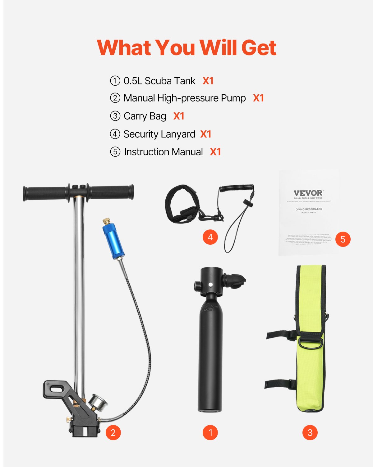VEVOR 0,5L ronilačka boca, prijenosna boca za ronjenje, boca s kisikom za ronjenje, podržava 5-10 minuta podvodnog disanja, dubina ronjenja 30 m, punjiva boca zraka za disanje s pumpom