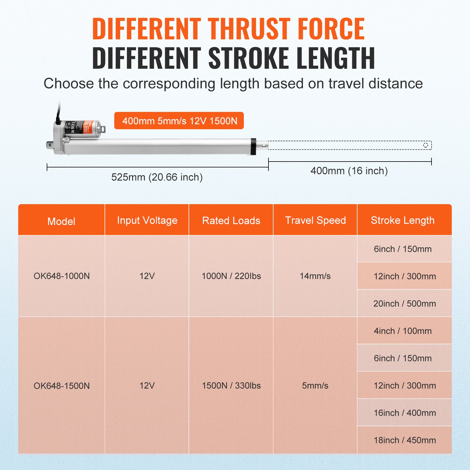 VEVOR 1500N Linearni aktuator DC 12V Linearni pogon IP54 Električni linearni motor Duljina hoda 400 mm Razina buke ≤60dB Električni otvarač vrata Brzina kretanja 5 mm/s Linearna tehnologija Pogon za podešavanje