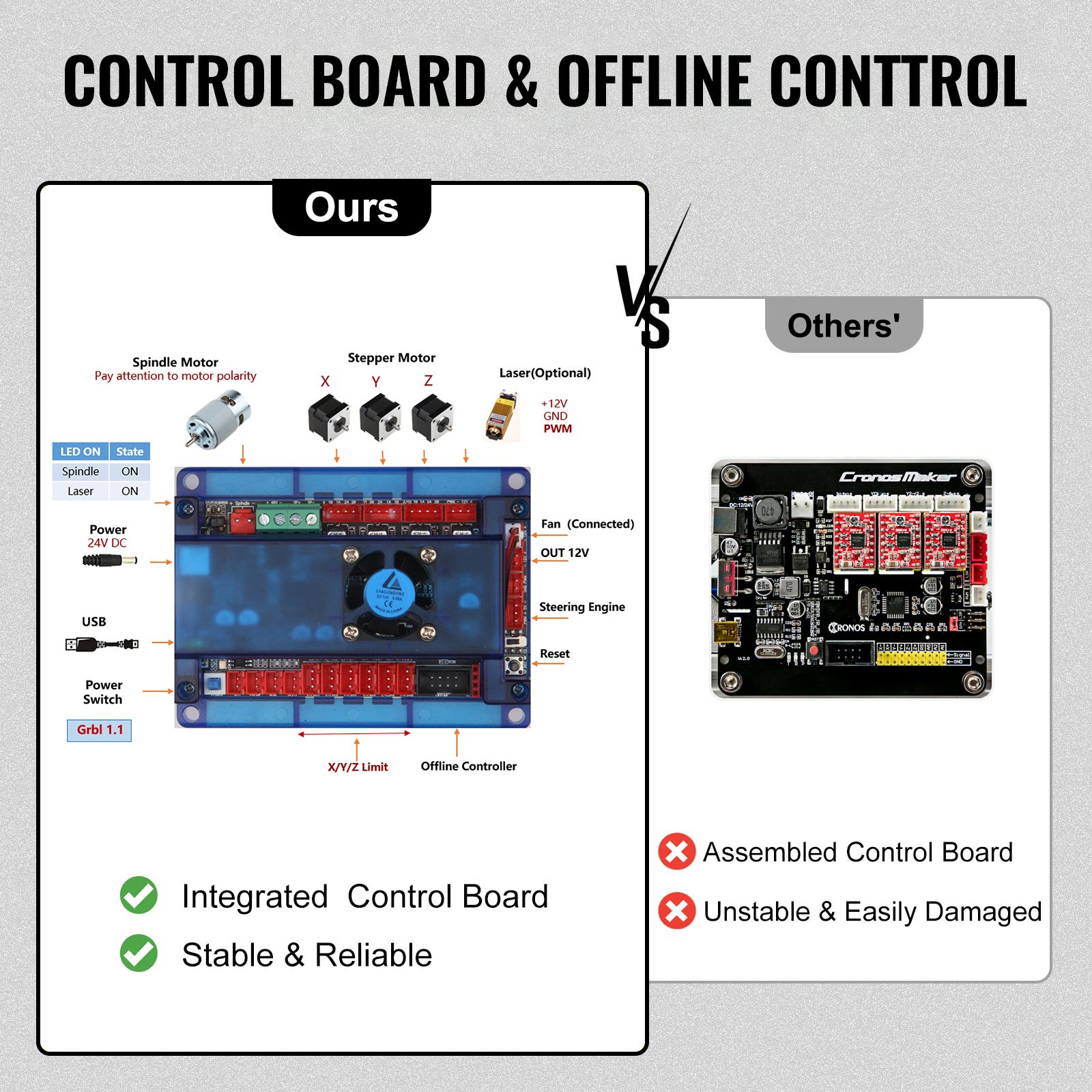 Brzina vretena: 10000 o/min, Model: VG-S3018 Pro, Promjer rezača: 0,125″ / 3,175 mm, Točnost pozicioniranja: 0,003″ / 0,07 mm, Efektivno radno područje (X x Y x Z): 11,8 x 7,1 x 1,8″ / 30 x 18 x 4,5 cm, Materijali: Aluminijski profil i bakelit, Dimenzije: 15,7 x 11,8 x 9,4″ / 400 x 300 x 240 mm, Ulazni napon: DC 24 V 5A, Koračni motor: Veličina 42, 12 V; Okretni moment: 0,25 N/m, Pogonske jedinice: vijci od nehrđajućeg čelika T8, Upravljački softver: GRBL kontrola