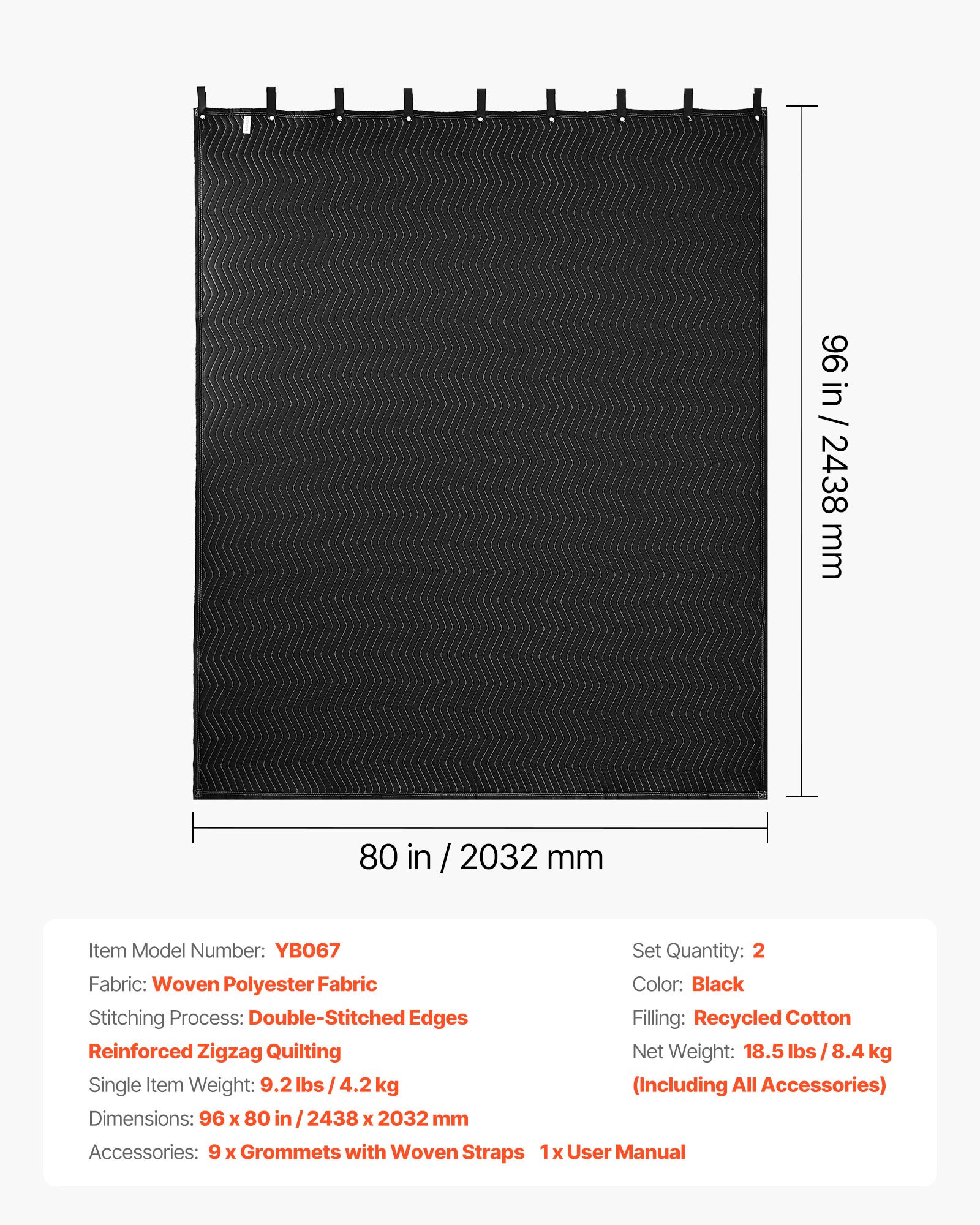 Dimenzije: 96 x 80 inča / 2438 x 2032 mm, Neto težina: 18,5 lbs / 8,4 kg (uključujući sav pribor), Količina u setu: 2, Boja: Crna, Broj modela artikla: YB067, Punjenje: Pamuk, Pojedinačna težina: 9,2 lbs / 4,2 kg, Tkanina: Tkana poliesterska tkanina, Postupak šivanja: Dvostruko prošiveni rubovi, ojačano cik-cak prošivanje