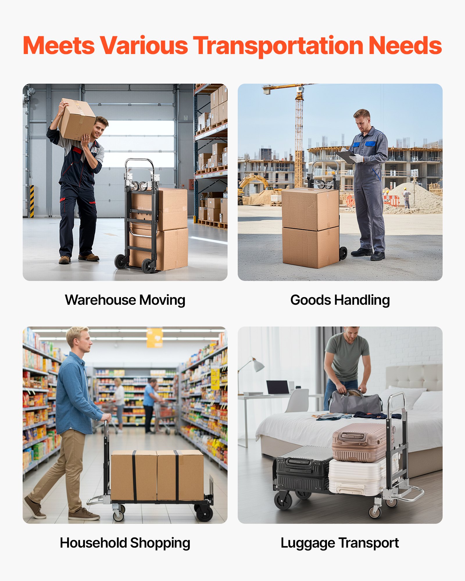 VEVOR 2-u-1 sklopiva ručna kolica, nosivost 227 kg u načinu rada na 4 kotača, konvertibilna kolica s podesivom ručkom, ručna kolica, transportna kolica za selidbu, ured, skladište