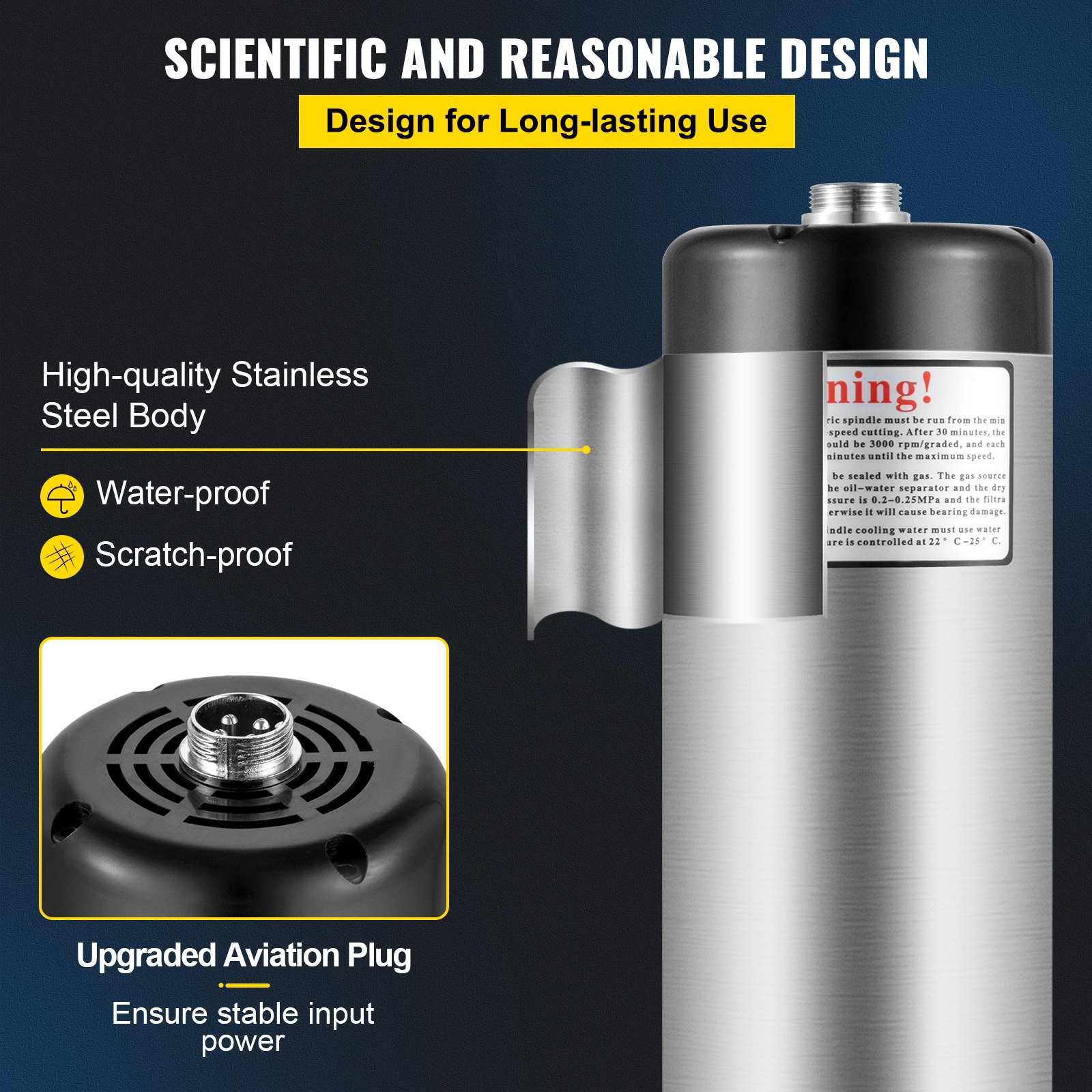 Odstupanje: Manje od 0,002 mm, Frekvencija: 200-400 Hz, Brzina: 12000-24000 o/min, Napon: 220 V, Maksimalni okretni moment: 1,7 Nm, Dimenzije proizvoda: 3,1 x 11,8 in / 8 x 29,9 cm, Snaga: 2,2 kW, Težina: 13,2 lbs / 6 kg