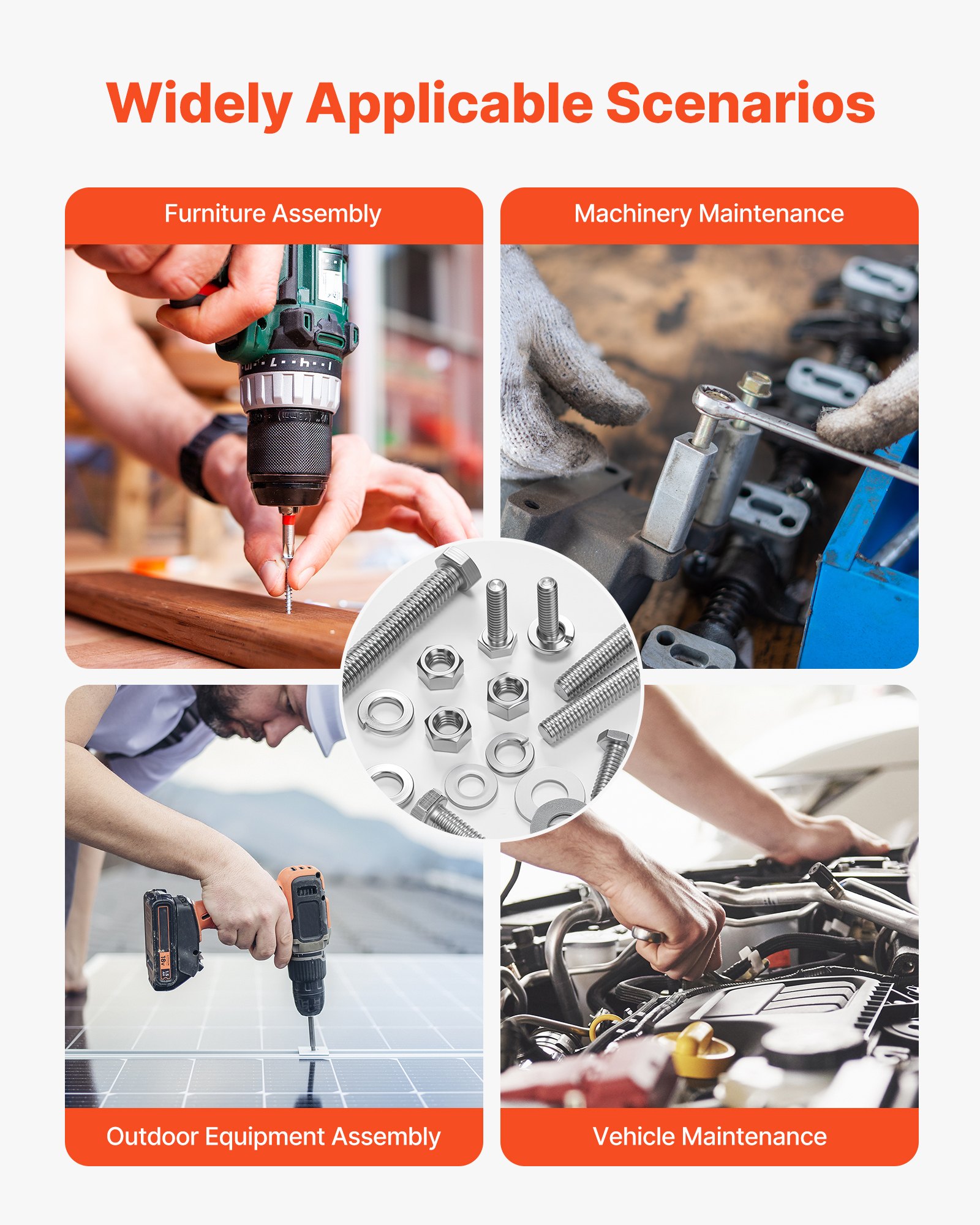 VEVOR asortiman vijaka i matica od 246 dijelova, vijci u inčima i Podloške od nehrđajućeg čelika 1/4-20, 5/16-18, 3/8-16, opružne podloške za montažu namještaja/uređaja/vozila s kutijom, stupanj kvalitete A2-50