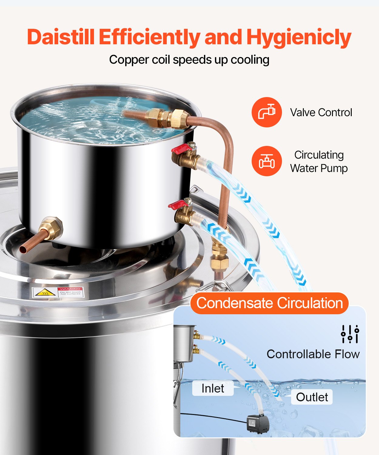 VEVOR 50L sustav za destilaciju vode i alkohola od nehrđajućeg čelika s bakrenom zavojnicom, komplet za kućnu fermentaciju, rafiniranje piva s termometrom i pumpom, za vino, viski, rakiju, srebro