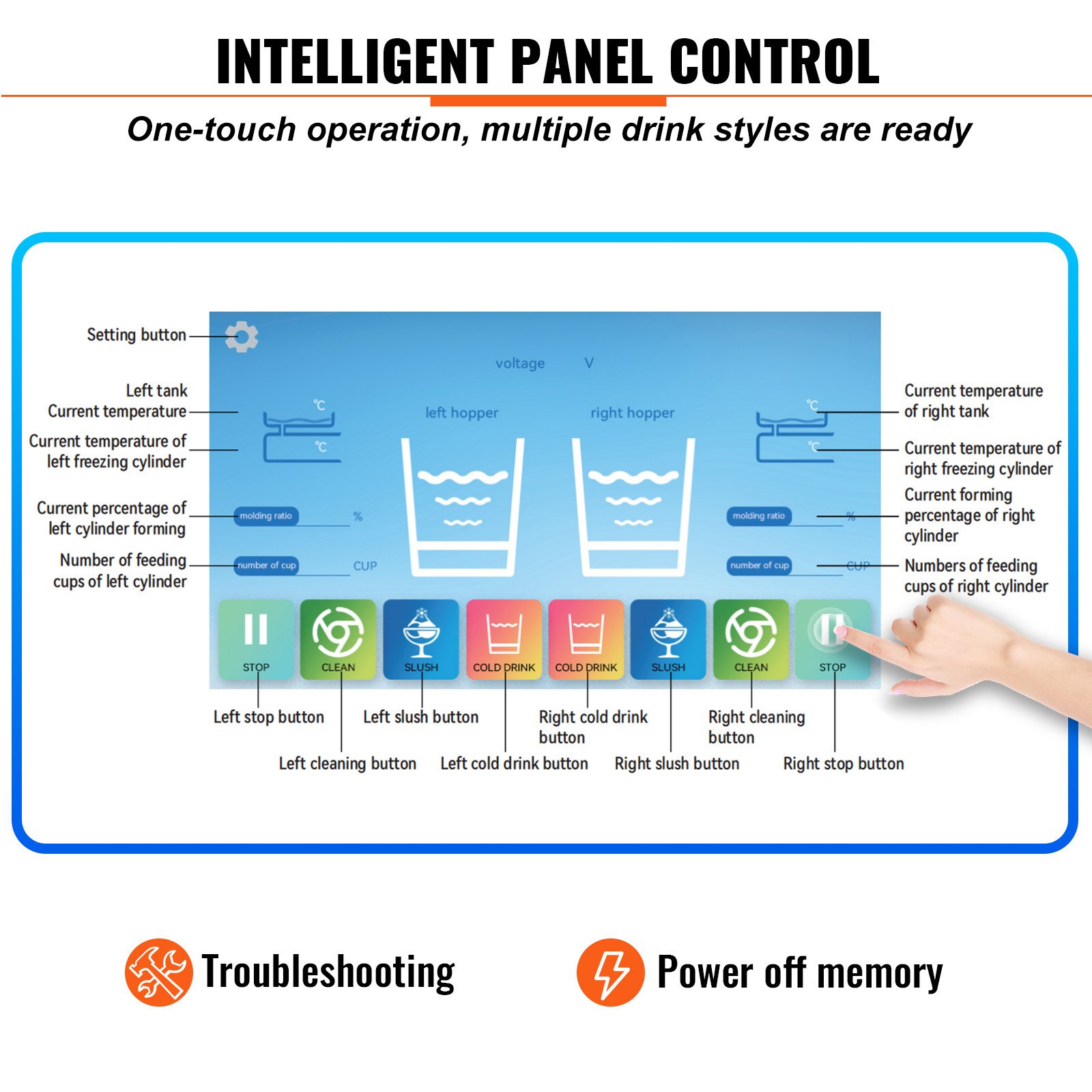Kontinuirani izlaz: 26-32 L/h slushieja; 15-21 L/h alkohola, Model: XRJF-22, Rashladno sredstvo: R410, Dimenzije proizvoda (D x Š x V): 22,4 x 26,8 x 36,4 inča / 570 × 680 × 925 mm, Neto težina: 207,3 lbs / 94 kg, Kapacitet: 2 x 2,1 US Gal / 2 x 8 L, Napon: AC 220~240 V 50Hz, Nazivna snaga: 1800 W, Snaga kompresora: 1220 W, Materijal: Nehrđajući čelik 304 + nehrđajući čelik 201