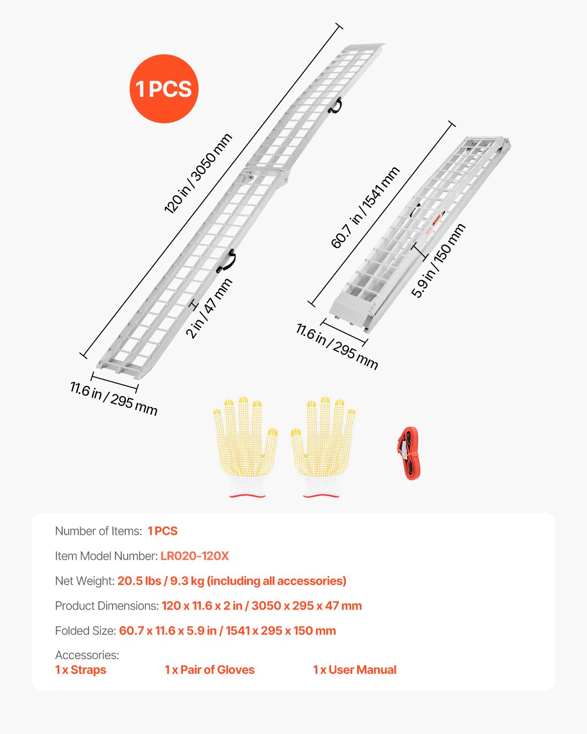 VEVOR aluminijska rampa, teška utovarna rampa (nosivost 272 kg / duljina 3050 mm) sa širom površinom rampe, univerzalna stabilna utovarna rampa s ručkama, za ATV, UTV, električni bicikl