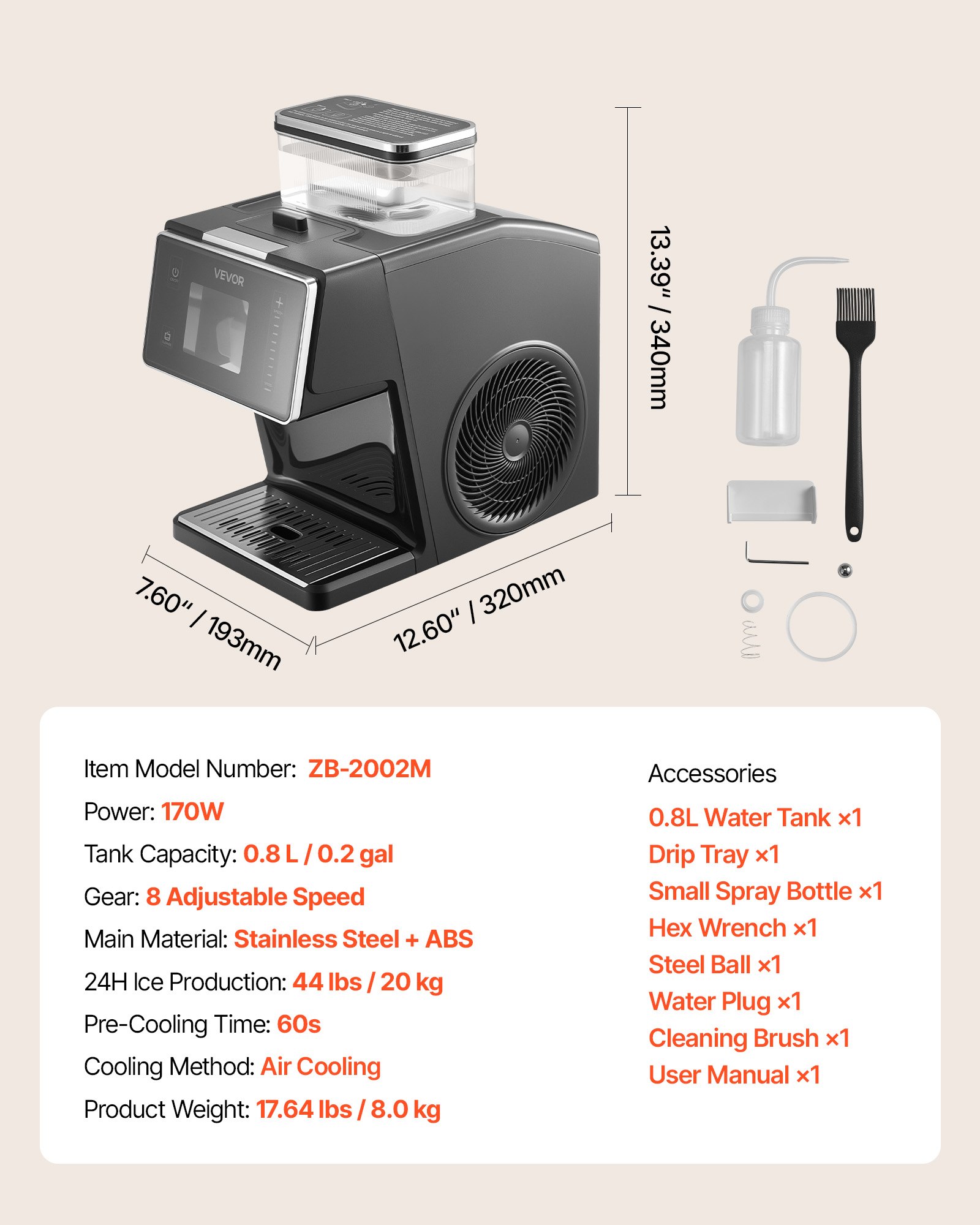 Kapacitet spremnika: 0,8 l / 0,2 galona, Težina proizvoda: 17,40 lbs / 7,9 kg, Brzine: 8 podesivih brzina, Glavni materijal: Nehrđajući čelik + ABS, Snaga: 170 W, Vrijeme prethodnog hlađenja: 60 s, Broj modela artikla: ZB-2002M, Proizvodnja leda u 24 sata: 44 lbs / 20 kg, Način hlađenja: Zračno hlađenje
