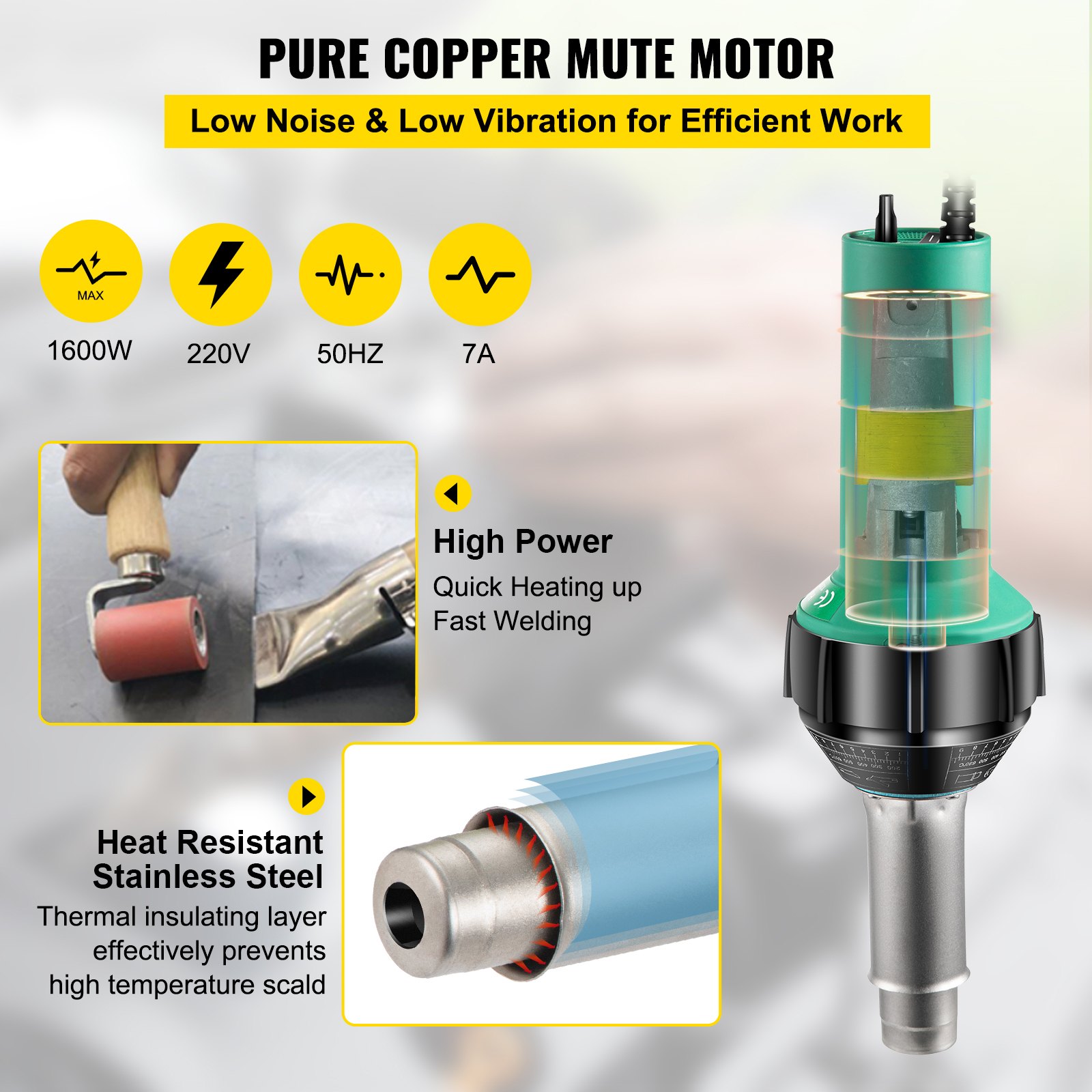 VEVOR Aparat za zavarivanje plastike, pištolj na vrući zrak 1600 W, pištolj za zavarivanje PVC-a, 4 zamjenske mlaznice, aparat za zavarivanje plastike vrućim zrakom 40-60℃, pištolj za zavarivanje, kabel od 3 m za zavarivanje PE, PP i PVC plastičnih ploča