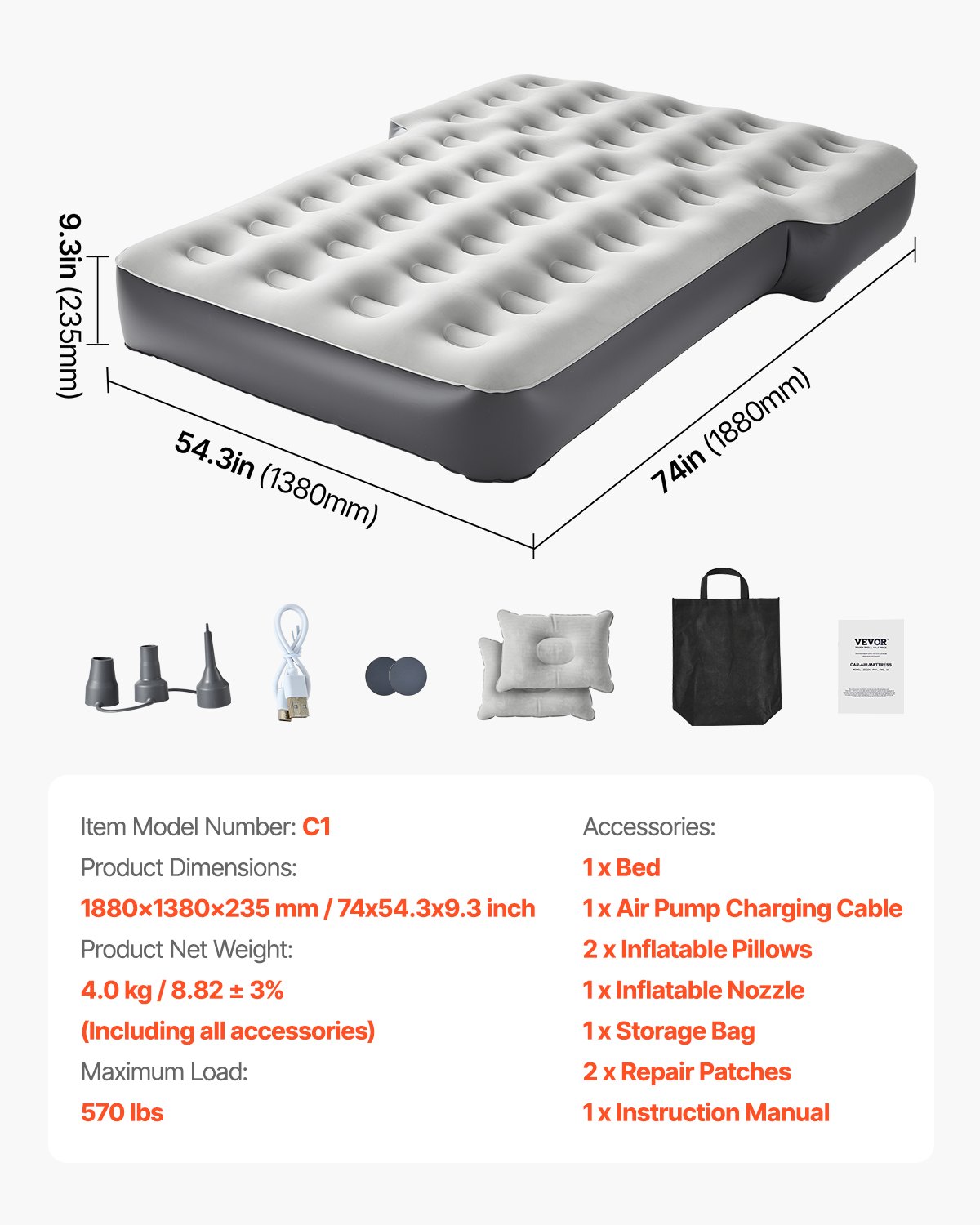 VEVOR auto zračni madrac prikladan za Toyota 4Runner / Jeep Wrangler, napuhavanje madraca za kampiranje, putni krevet s flokerom i zadebljanim materijalom, prijenosna prostirka za spavanje s ugrađenom pumpom i 2 jastuka, siva