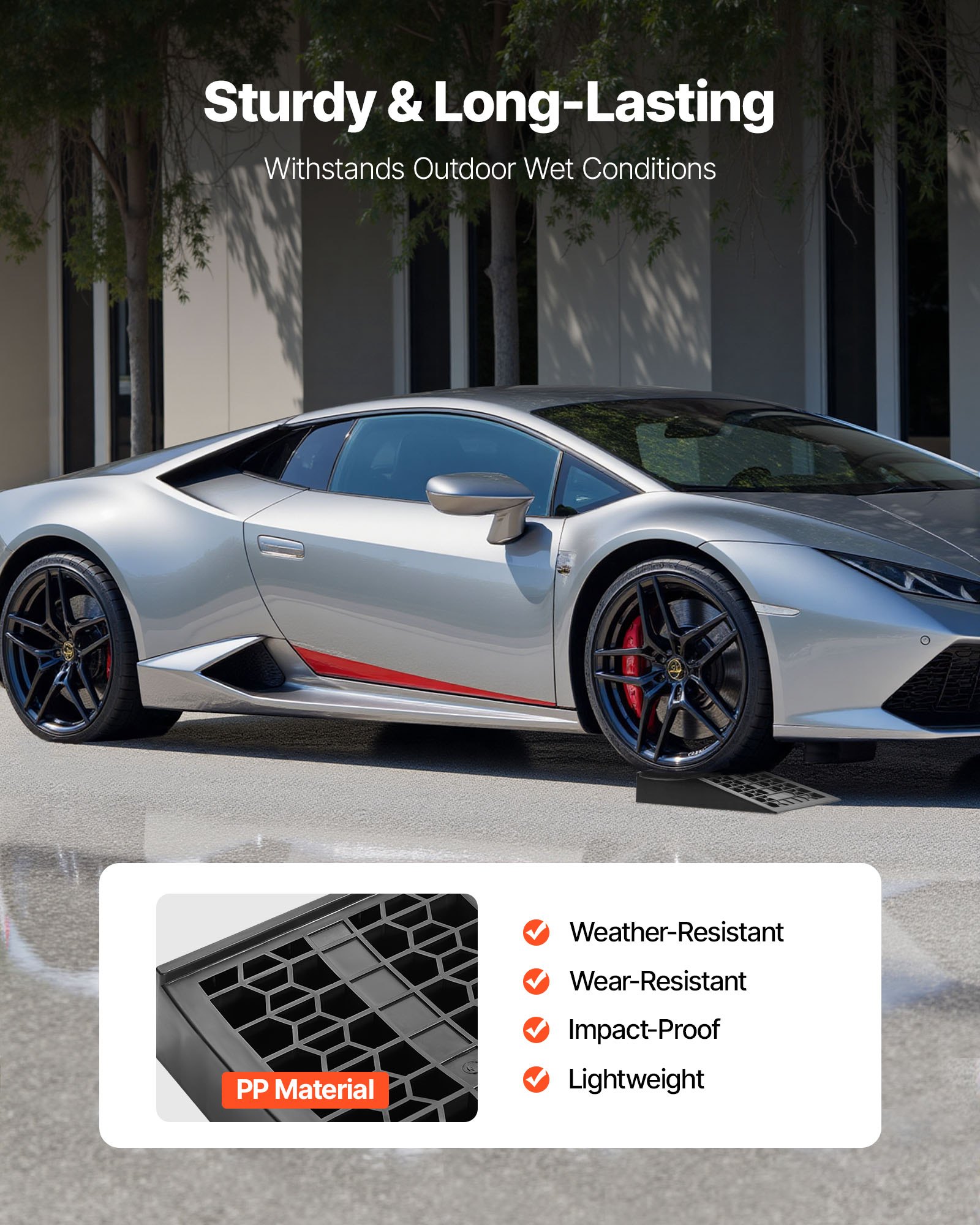 VEVOR rampe za automobile, pakiranje od 2 komada, visina podizanja 66 m, prijenosne i niskoprofilne rampe za servis automobila za održavanje garaža, izmjenu ulja i popravke kamiona, nosivost 2268 kg (po rampi) Rampe za popravak automobila Rebrasta površina Jednostavne za korištenje Lagane i prijenosne pomoć pri održavanju Proširene rampe Broj artikala: 2 kom, Neto težina: 5,3 lbs / 2,42 kg, Glavni materijal: PP, Boja: Crna, Broj modela artikla: TS265, Dimenzije proizvoda: 17,4 x 9,8 x 3,23 in / 443 x 249 x 83 mm