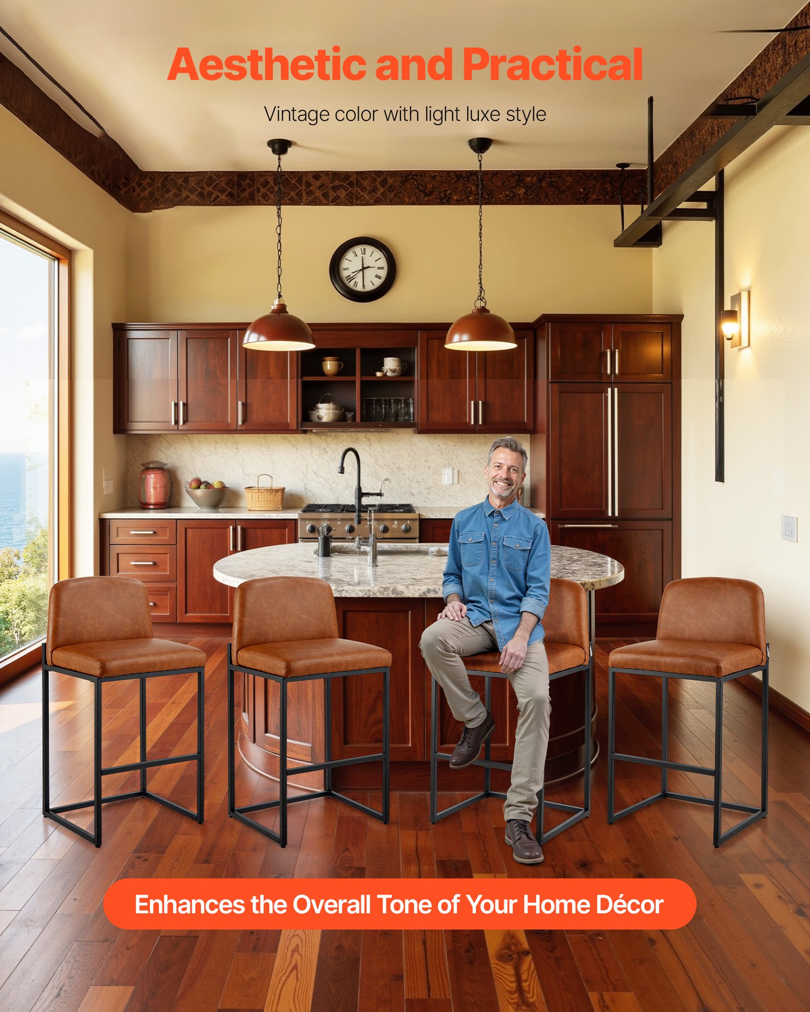 VEVOR Barske stolice, Barske stolice, Set od 4 (visina 925 mm), Kuhinjske stolice od PU kože s naslonom i metalnim okvirom, Bistro stolice (nosivost 149,7 kg) za kuhinju, blagovaonicu, bar, kuhinjski otok, Smeđa