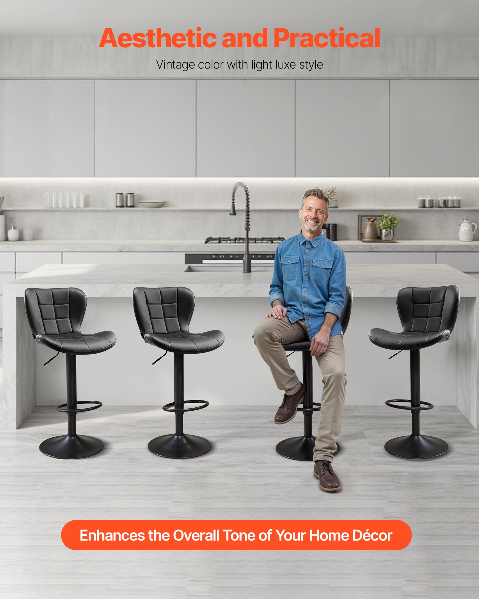 VEVOR Barske stolice, Set od 4, Moderne barske stolice od PU kože, Bistro stolice s naslonom za leđa i noge koje se okreću za 360°, Kuhinjske stolice s podesivom visinom (nosivost 149,7 kg) za blagovaonicu, Crne
