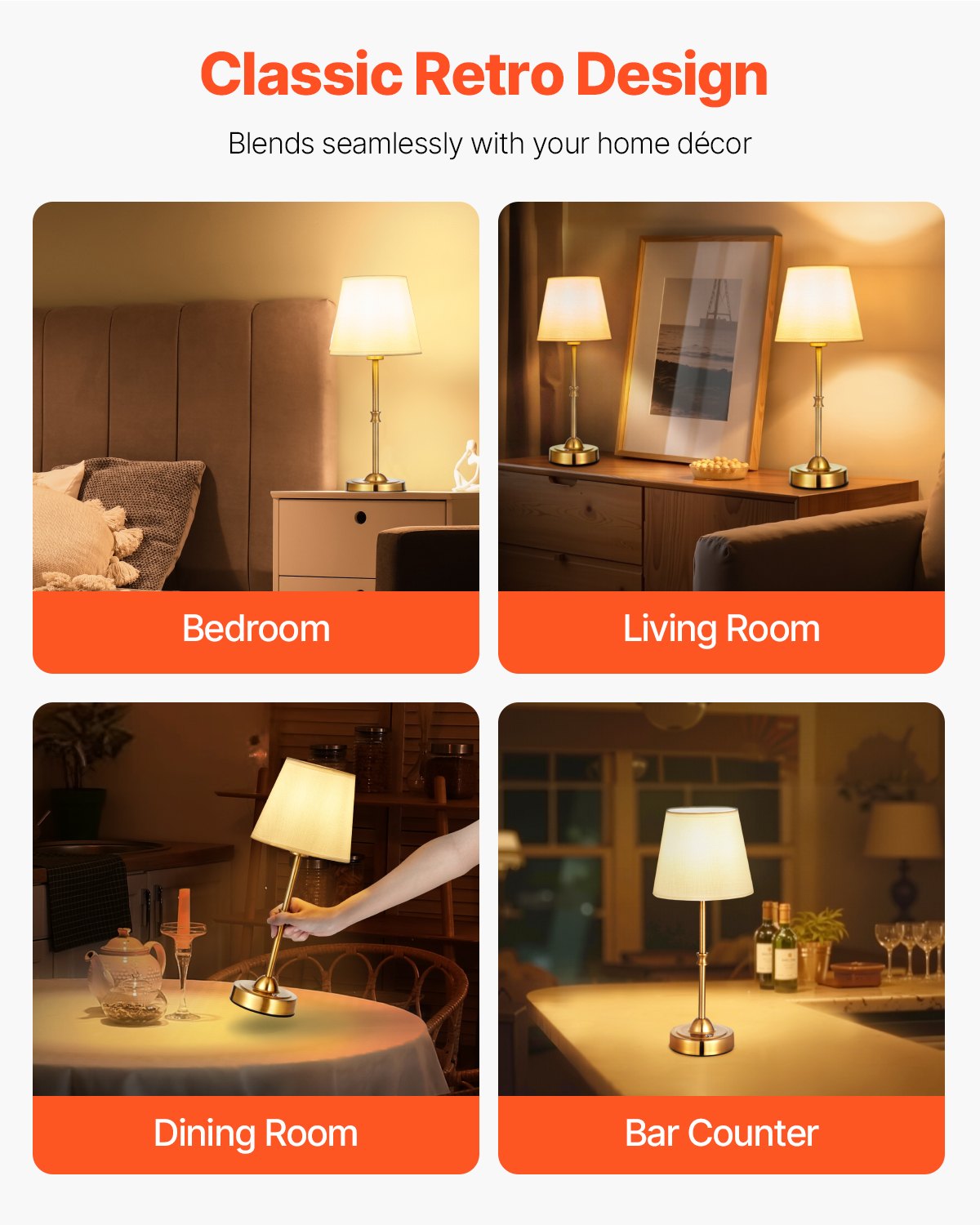 VEVOR Bežična stolna lampa (2 kom.) s platnenim sjenilom i ugrađenom punjivom baterijom od 5200 mAh, stolna lampa, prigušljiva (3 stupnja), stolna lampa za noćni ormarić u spavaćoj sobi, zlatna