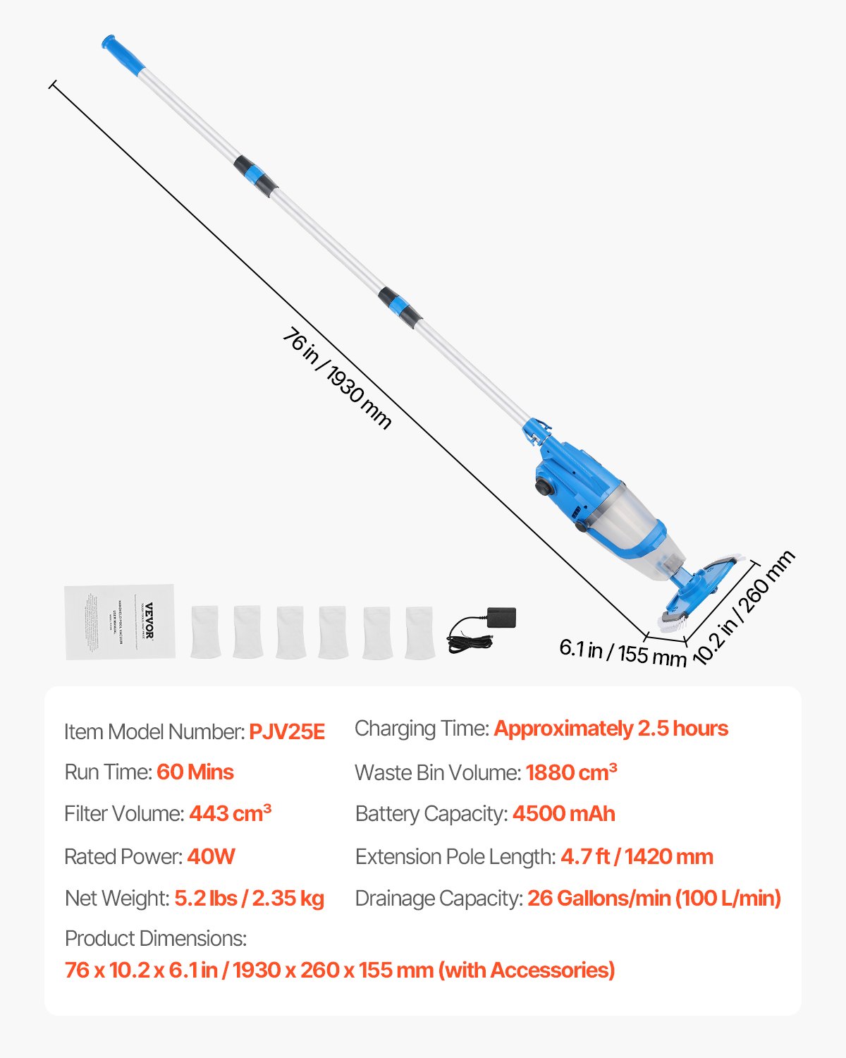 Kapacitet odvoda: 26 GPM (100 L/min), Duljina produžne cijevi (ukupno): 4,7 ft / 1420 mm, Neto težina: 5,2 lbs / 2,35 kg, Kapacitet baterije: 4500 mAh, Volumen filtera: 443 cm³, Nazivna snaga: 40 W, Broj modela artikla: PJV25E, Vrijeme punjenja: cca. 2,5 sata, Vrijeme rada: 1 sat, Volumen spremnika za otpad: 1880 cm³, Dimenzije proizvoda: 76,0 x 10,2 x 6,1 in / 1930 x 260 x 155 mm (s priborom)