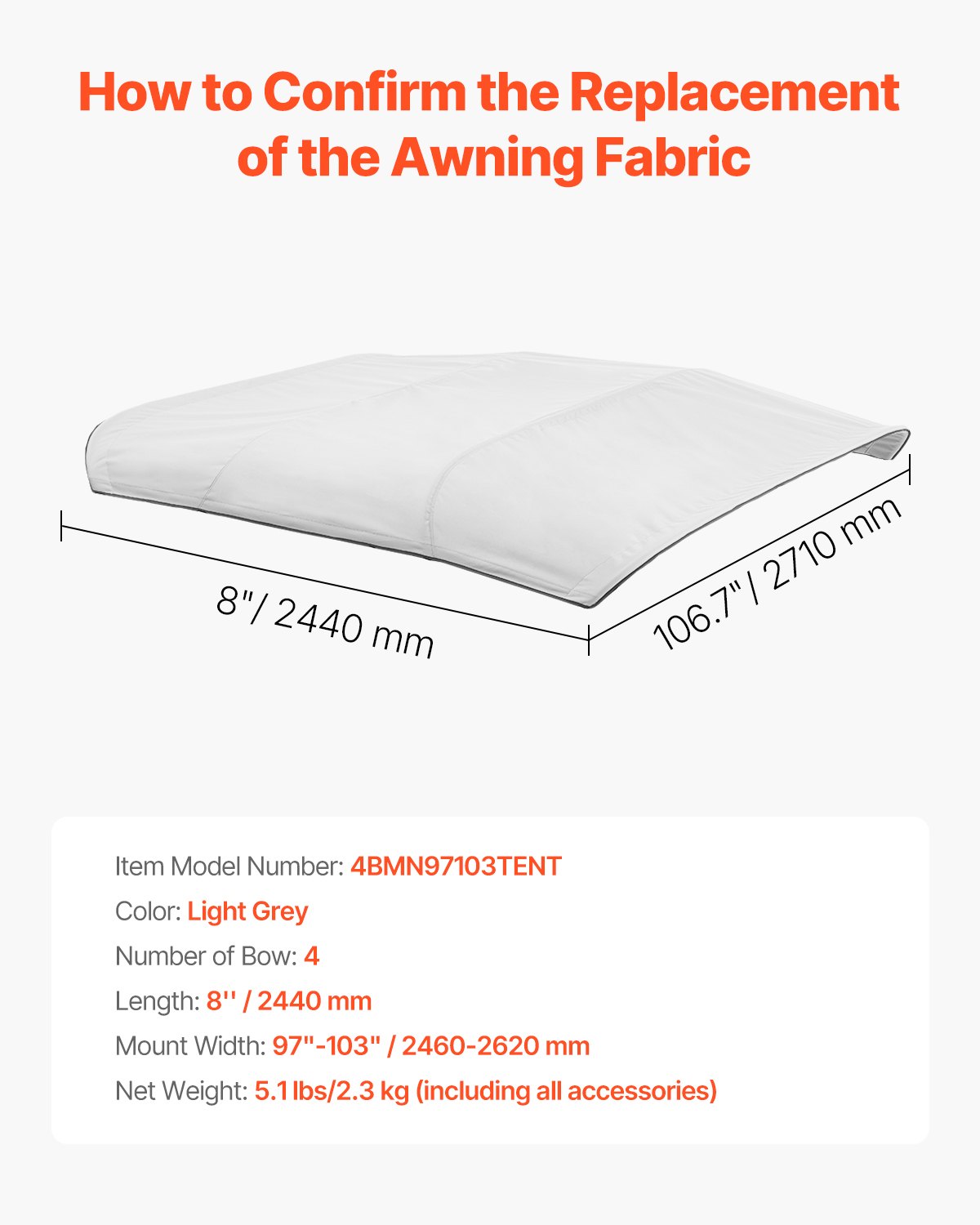 VEVOR Bimini Top zamjenska tenda za sunce (4 luka) izrađena od 600D poliestera, vodootporna tenda za sunce s torbom za pohranu (bez potporne šipke) 241-262 cm (Š) svijetlo siva
