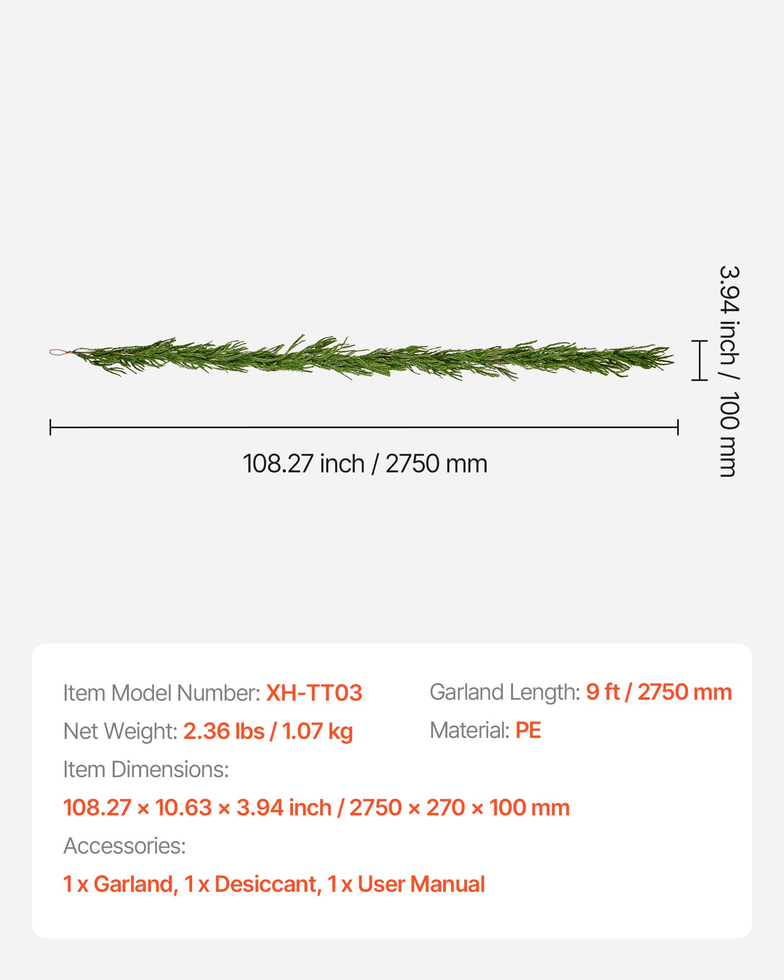 Dimenzije artikla: 108,27 x 10,63 x 3,94 in / 2750 x 270 x 100 mm, Neto težina: 2,36 lbs / 1,07 kg, Broj modela artikla: XH-TT03, Duljina girlande: 9 ft / 2750 mm, Materijal: PE