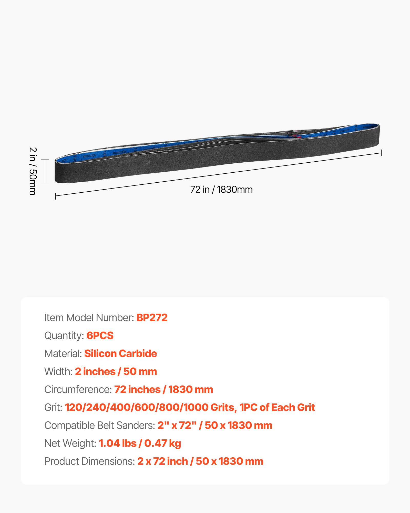 Količina: 6 komada, Neto težina: 1,04 lbs / 0,47 kg, Kompatibilne tračne brusilice: 2 x 72 in / 50 x 1830 mm, Širina: 2 in / 50 mm, Broj modela artikla: BP272, Materijal: silicijev karbid, Granulacija: 120/240/400/600/800/1000 granulacije, 1 komad svake granulacije, Dimenzije proizvoda: 2 x 72 in / 50 x 1830 mm, Opseg: 72 in / 1830 mm