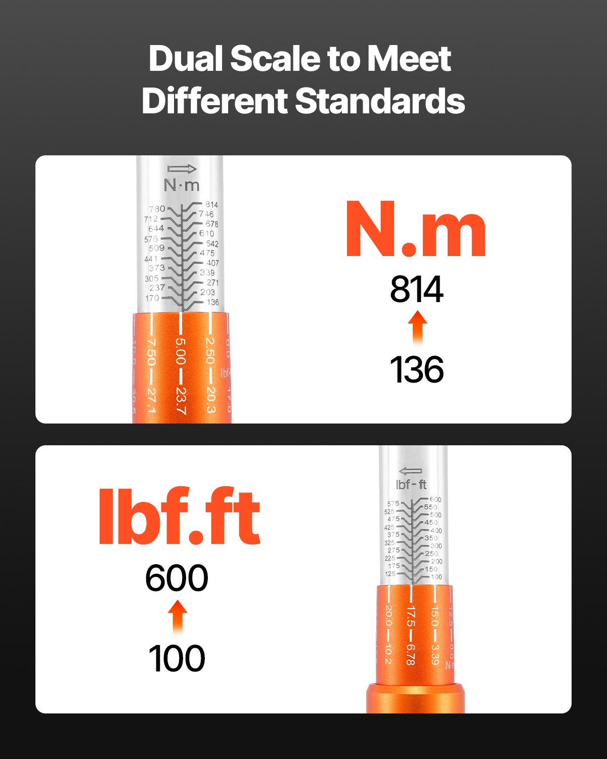 VEVOR Click moment ključ, pogon 3/4 inča 136–814 Nm, dvosmjerni set moment ključeva s dvostrukim rasponom skala, 48 zuba ±3% visokoprecizni legirani čelik za popravak automobila, narančasta boja