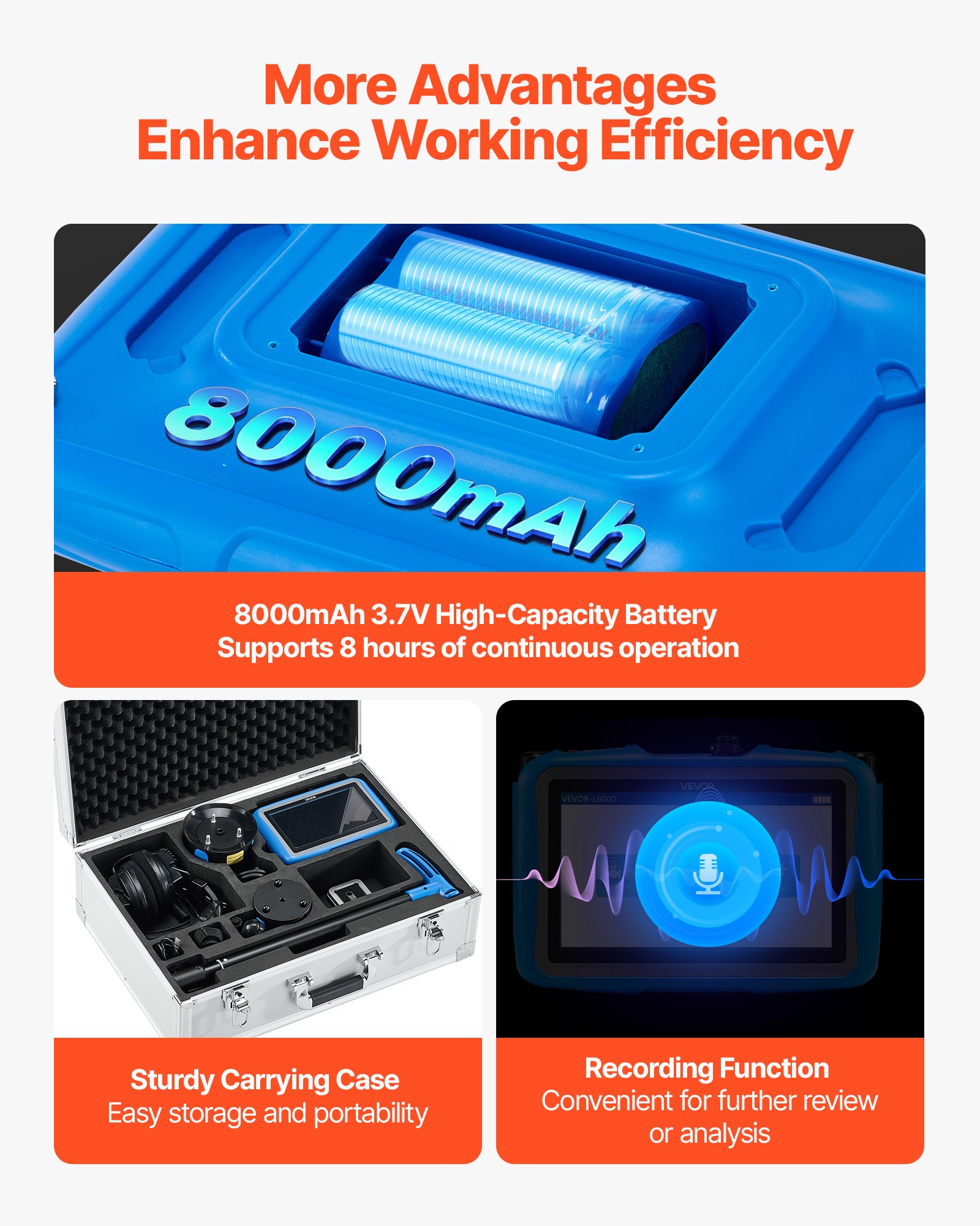 Zaslon: 7-inčni zaslon osjetljiv na dodir, Frekvencijski raspon: 1 Hz – 10 000 Hz, Neto težina: 16,8 lbs / 7,6 kg, Kapacitet baterije: 8000 mAh / 3,7 V, Dubina detekcije: 197 inča / 5 m, Broj senzora: 2, Broj modela artikla: VEVOR-L6000, Materijal kućišta: ABS, SD kartica: 8 GB, Dimenzije proizvoda: 8,7 x 5,9 x 2 inča / 220 x 150 x 50 mm