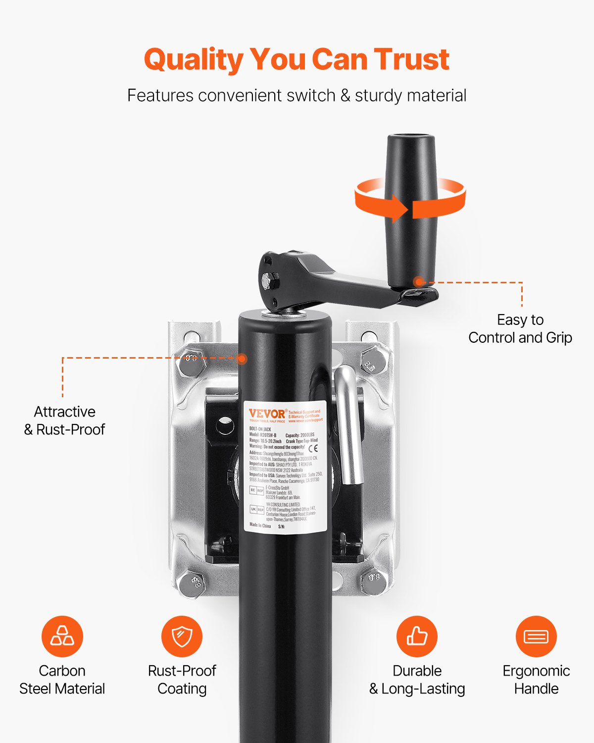 VEVOR dizalica za prikolice, dinamička nosivost 907 kg, okretni stalak za teške uvjete rada, potporni stalak 265-515 mm s ručkom za kamp-prikolice, prikolice za konje, komunalne prikolice i prikolice za jahte