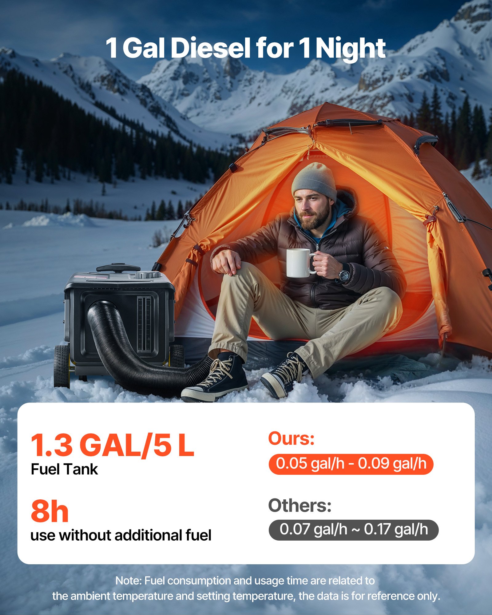 Potrošnja goriva: 0,05 – 0,09 gal/h (0,18–0,37 L/h), Zaštita od pregrijavanja: ≥518 ℉ / 270 ℃, Učinkovitost izgaranja: ≥ 90%, Neto težina: 24,0 lbs / 10,9 kg (uključujući sav pribor), Raspon podešavanja temperature: 46,4–96,8 ℉ / 8–36 ℃, Broj modela artikla: ZM8008, Buka pri radu: ≤ 75 dB, Promjer otvora za zrak: 75 mm, Dimenzije proizvoda: 566 x 400 x 321 mm, Omjer zraka i goriva: 2300–4400 o/min, 1,4–5,0 Hz, Kapacitet spremnika goriva: 5 l