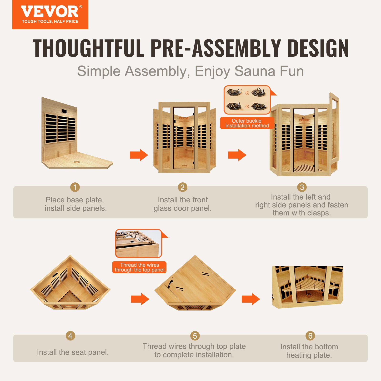 VEVOR Drvena infracrvena sauna, kućna sauna spa, za 3 do 4 osobe, Infracrvena sauna niskog EMF-a izrađena od kukute s vratima od kaljenog stakla, Bluetooth zvučnicima i terapijom bojama, 2470 W za unutarnju upotrebu