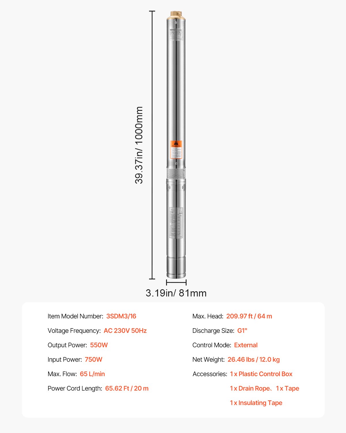 Maks. Visina: 64 m, Veličina izlaza: G1″, Neto težina: 12,0 kg, Ulazna snaga: 750 W, Broj modela: 3SDM3/16, Frekvencija napona: AC 230 V 50 Hz, Izlazna snaga: 550 W, Maks. protok: 65 L/min, Dimenzije proizvoda: 1000 x 81 x 81 mm, Način upravljanja: Vanjski