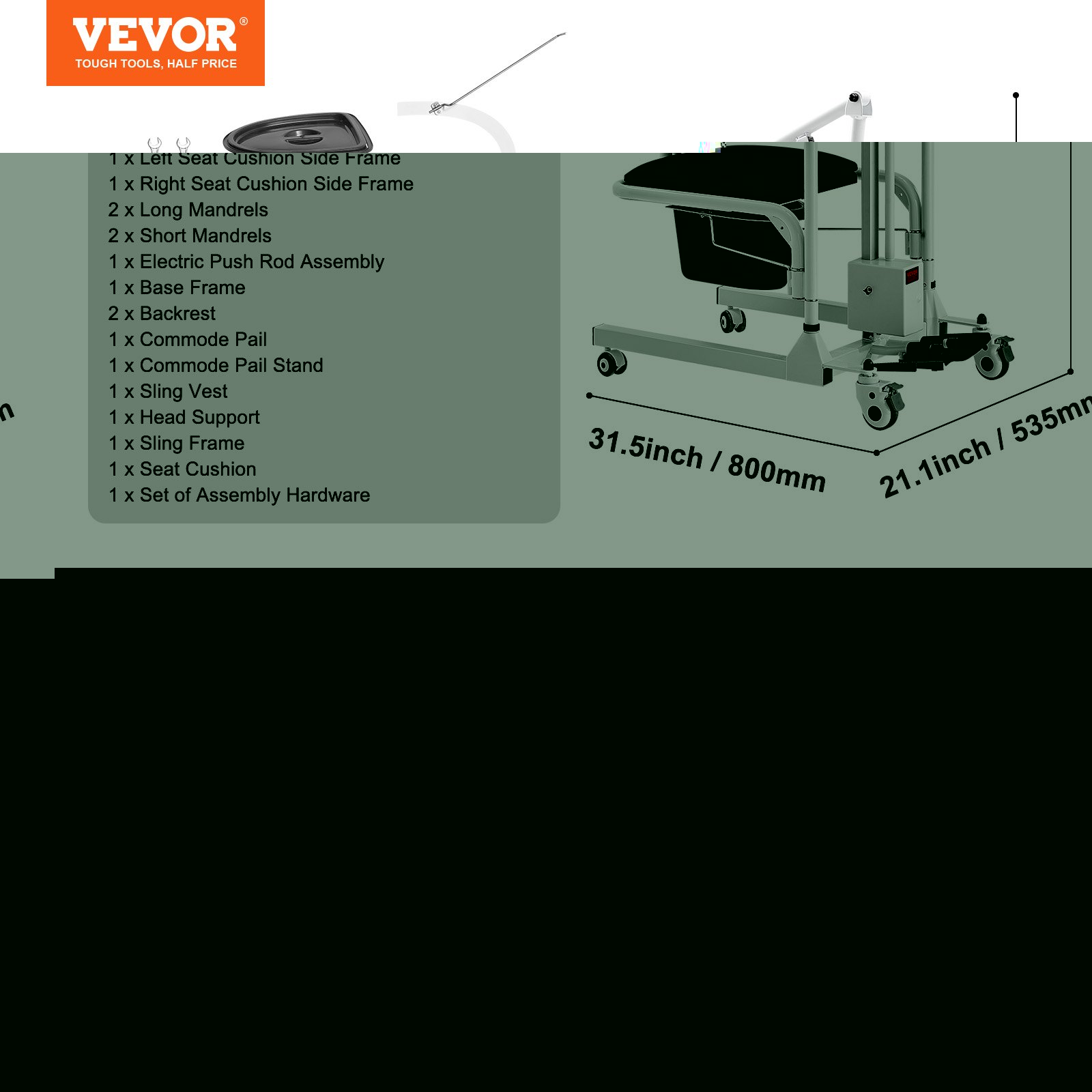 VEVOR Električna stolica za prijenos pacijenata, Električna invalidska kolica s remenom i podesivom visinom, Stolica za noćni tuš s podijeljenim sjedalom od 180° i posudom za starije osobe s invaliditetom, Nosivost 100 kg