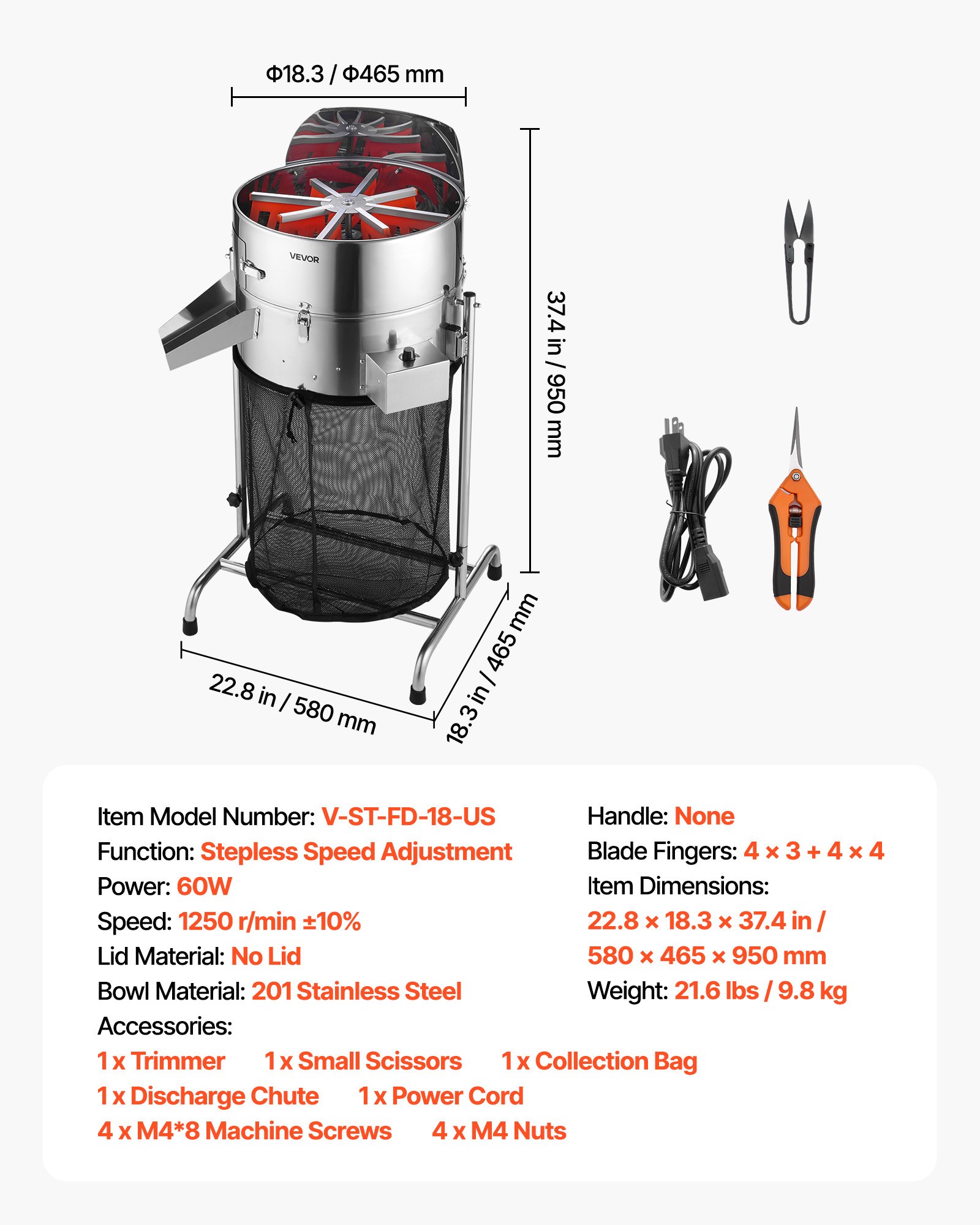 VEVOR Električni stroj za berbu, rezač pupova 465 mm s oštricama od nehrđajućeg čelika i podesivom brzinom, hidroponski stroj za rezanje s vrećom za sakupljanje, ručne škare, za lišće i pupoljke