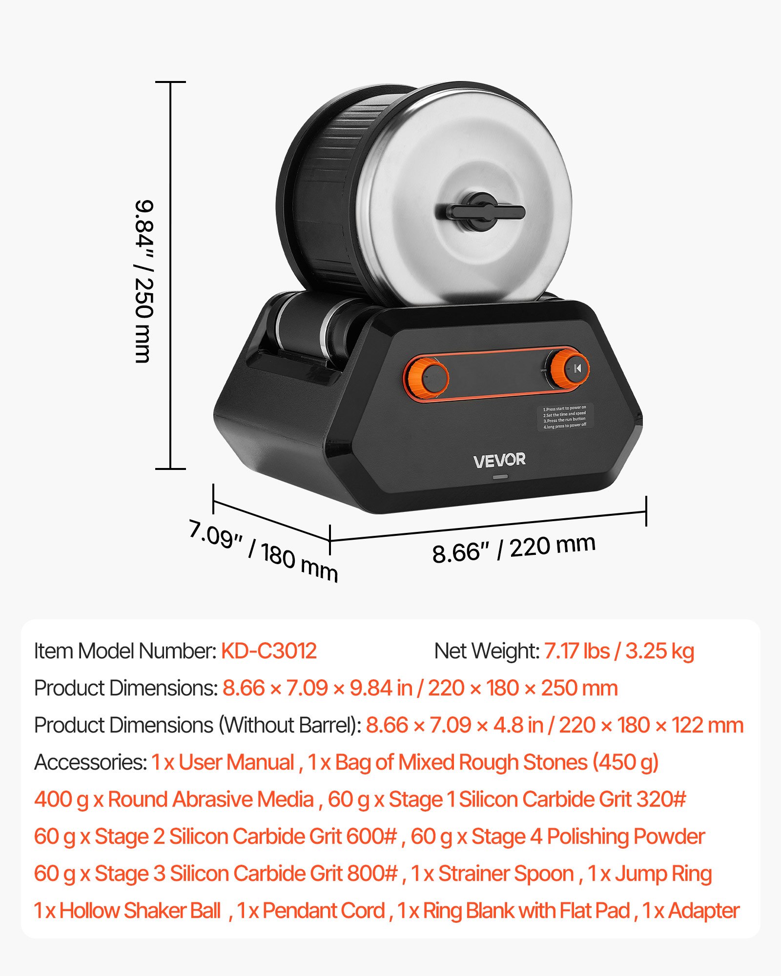 VEVOR Električni stroj za poliranje kamena Nosivost 1,36 kg, 4 postavke brzine, Set za poliranje kamena sa sirovim dragim kamenjem i polirajućim zrnima i 9-dnevnim timerom za poliranje i intuitivnom upravljačkom pločom, crni
