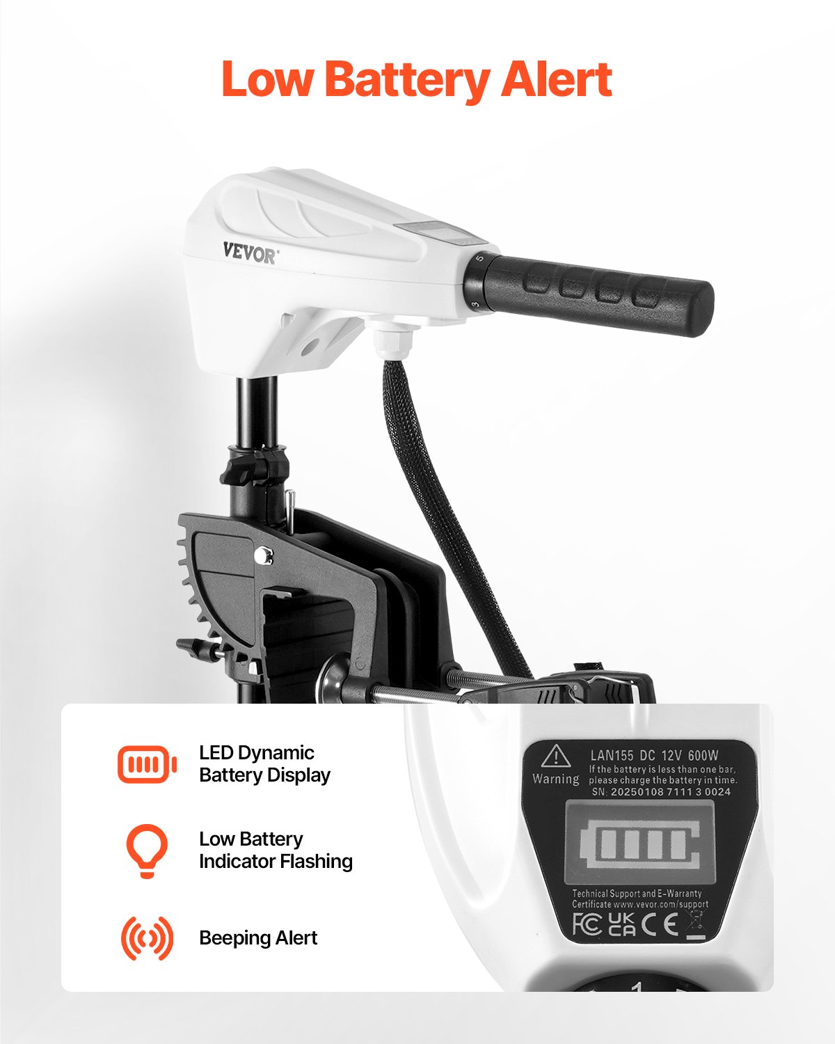 Brzina praznog hoda: 1750 o/min, Maksimalni potisak: 55 lbs / 25 kg, Radni napon: DC 12 V, Raspon izvlačenja ručke: 6,3 do 10,6 in / 16 do 27 cm, Neto težina: 20,3 lbs / 9,2 kg, Način upravljanja: Ručno upravljanje okretanjem ručke, Kontrola brzine: 5 brzina naprijed + 3 brzine unatrag, Broj modela artikla: LAN155, Dimenzije proizvoda: 39,4 x 19,3 x 8,1 inča / 1000 x 490 x 205 mm