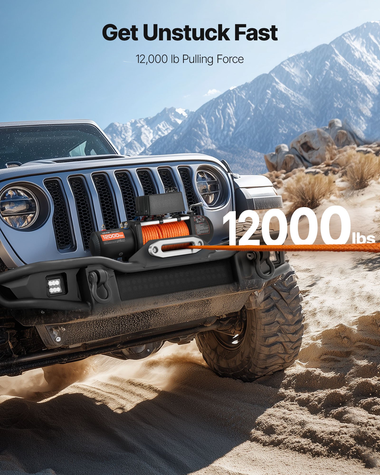 Specifikacije motora: 12 V DC, 5,5 KS, motor od čistog bakra, IP zaštita: IP55, Dimenzije artikla: 21,2 x 6,3 x 11 inča / 53,7 x 16 x 28 cm (s upravljačkom kutijom), Nazivna vučna sila: 12000 lbs / 5400 kg, Glavni materijali: Aluminijska legura, čelik, plastika, Neto težina: 50,5 lbs / 22,9 kg, Specifikacije užeta: Sintetičko uže, Promjer: Φ0,36 inča / 9,1 mm; Duljina: 75,5 ft / 23 m, Broj modela artikla: S12000, Prijenosni omjer: 265:1, Načini upravljanja: Bežični i žičani daljinski upravljač