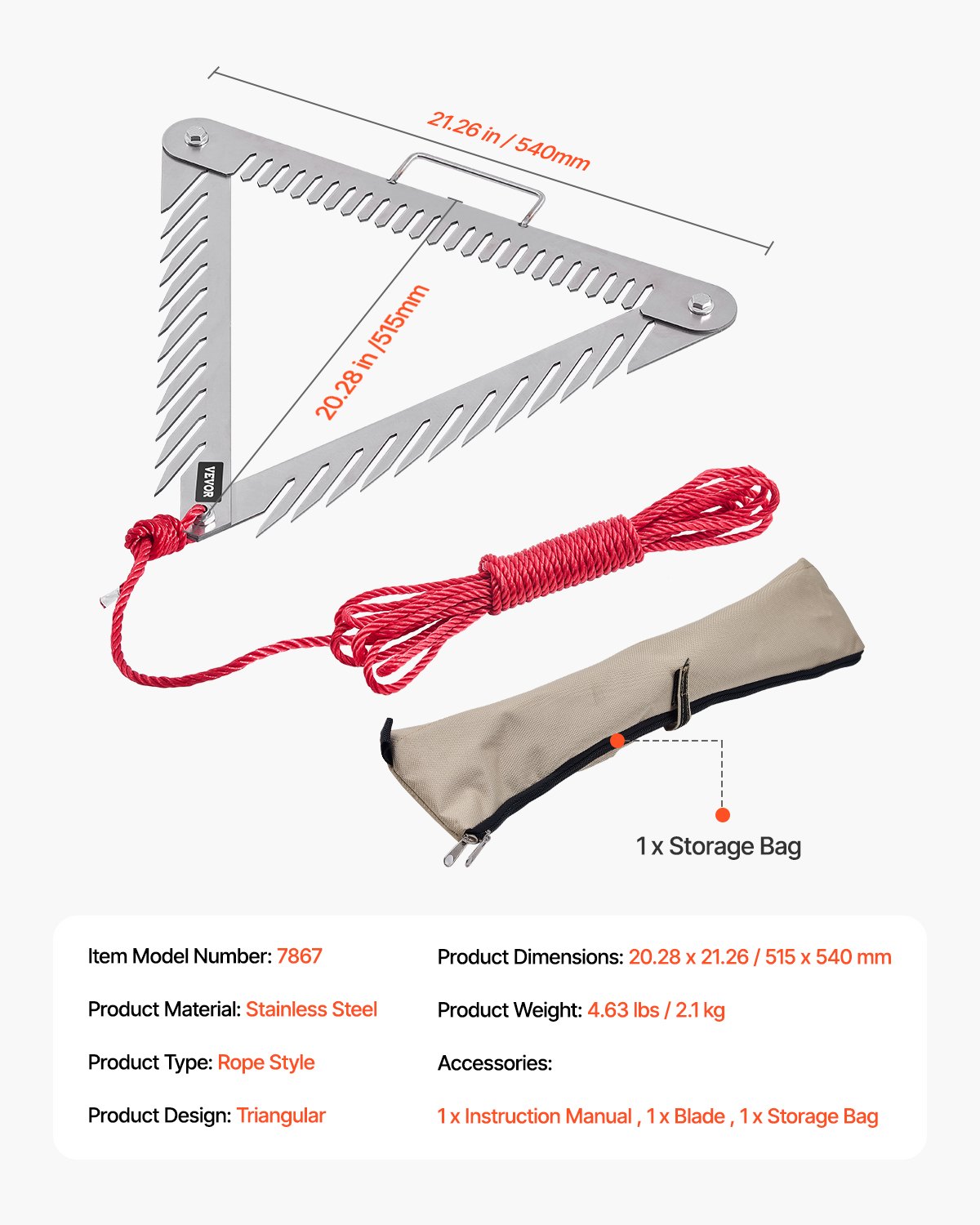 VEVOR grablje za ribnjak 515x540x9 mm, trostrane grablje za jezerski korov s ručkom, sklopivi brijač za travu za ribnjak, rezač korova od nehrđajućeg čelika s užetom od 9 m, za jezera i ribnjake