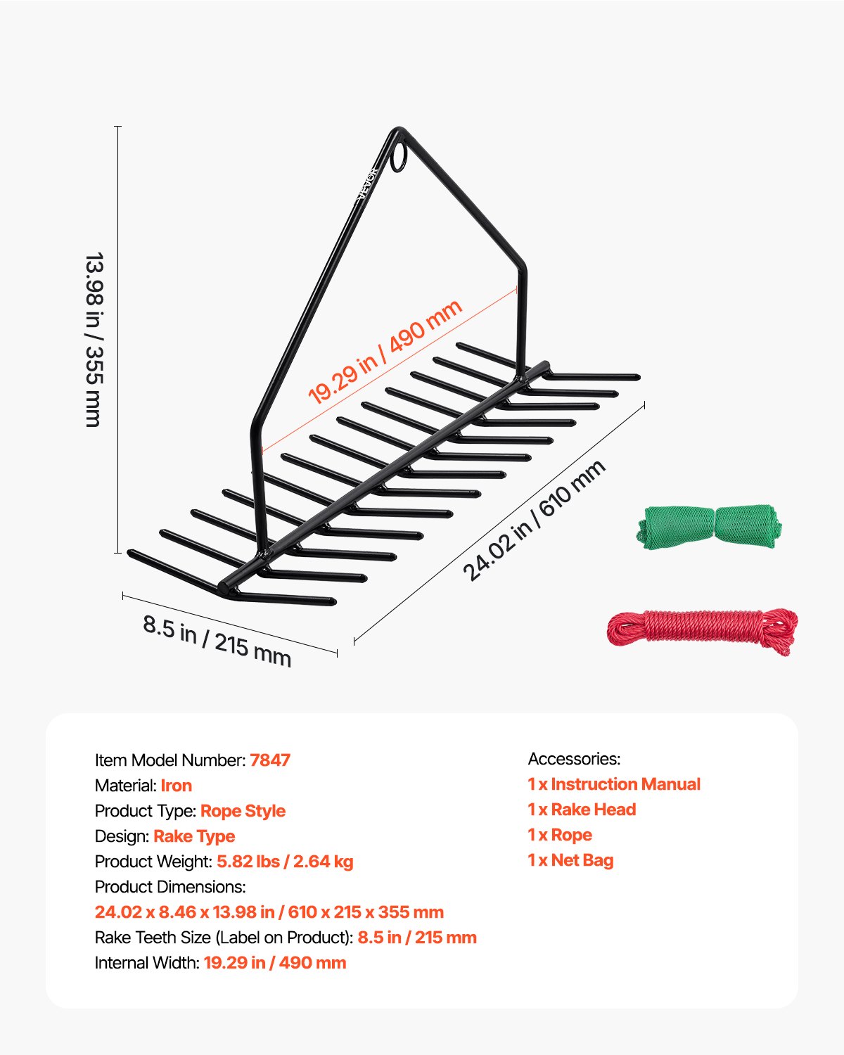 unutarnja širina: 490 mm, vrsta proizvoda: s užetom, težina proizvoda: 2,64 kg, dizajn: tip grablji, broj modela artikla: 7847, materijal: željezo, dimenzije proizvoda: 610 x 215 x 355 mm, veličina zubaca grablji (oznaka na proizvodu): 215 mm