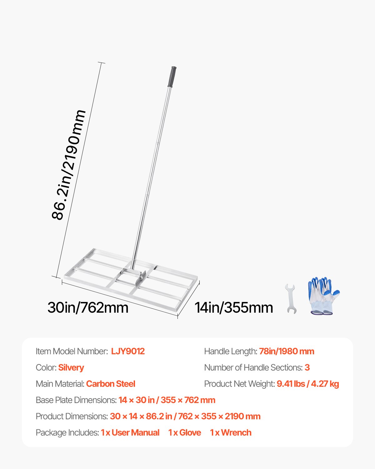 Neto težina proizvoda: 9,7 lbs / 4,40 kg, Broj dijelova drške: 3, Glavni materijal: Ugljični čelik, Duljina drške: 78 in / 198 mm, Boja: Srebrna, Broj modela artikla: LJY9012, Dimenzije osnovne ploče: 14 x 30 in / 355 x 762 mm, Dimenzije proizvoda: 30 x 14 x 86,2 in / 762 x 355 x 2190 mm