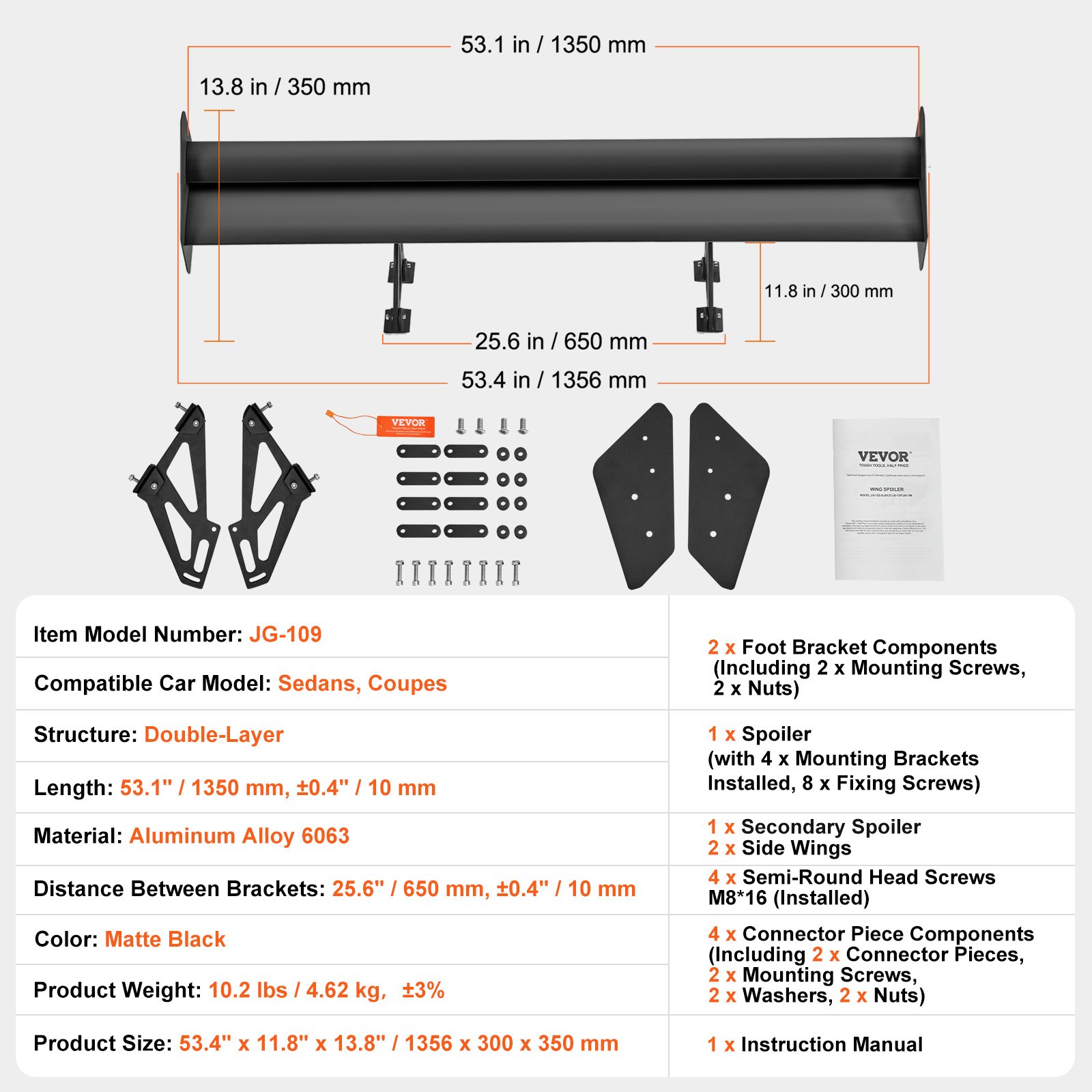 Boja: mat crna, veličina proizvoda: 53,4 x 11,8 x 13,8 inča / 1356 x 300 x 350 mm, kompatibilni model automobila: limuzine, kupei, udaljenost između nosača: 25,6 inča / 650 mm, ±0,4 inča / 10 mm, težina proizvoda: 10,2 lbs / 4,62 kg, ± 3%, struktura: dvostruki spojler, materijal: aluminijska legura 6063, broj modela artikla: JG-109, duljina: 53,1 inča / 1350 mm, ±0,4 inča / 10 mm