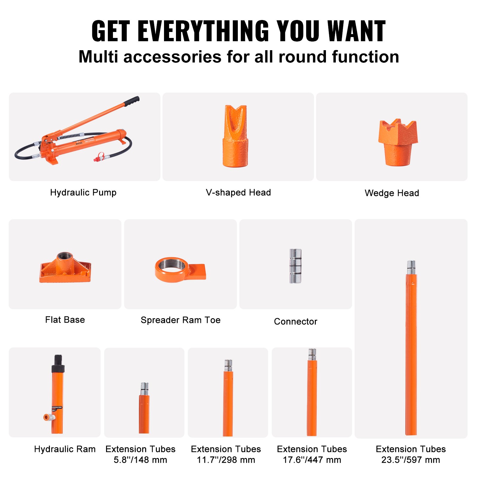 Glavni materijal: QT450, Veličina produžne šipke: 100 mm, 300 mm, 500 mm, Nosivost: 20 t, Cijev za ulje: 1,4 m, Težina: 34,5 kg, Duljina ručke: 535 mm, Površinska obrada: Elektrostatički raspršivač praha, Veličina kutije s alatom: 29,5 x 11,6 x 6,5 inča / 750 x 295 x 165 mm, Hod: 5,7 inča / 145 mm, Materijal cilindra: Q235B, Vrsta hidrauličkog ulja: HV15, Materijal brtvenog prstena cilindra: TPU, Veličina pumpe: 19,9 x 3,6 x 3,3 inča / 500 x 92 x 85 mm