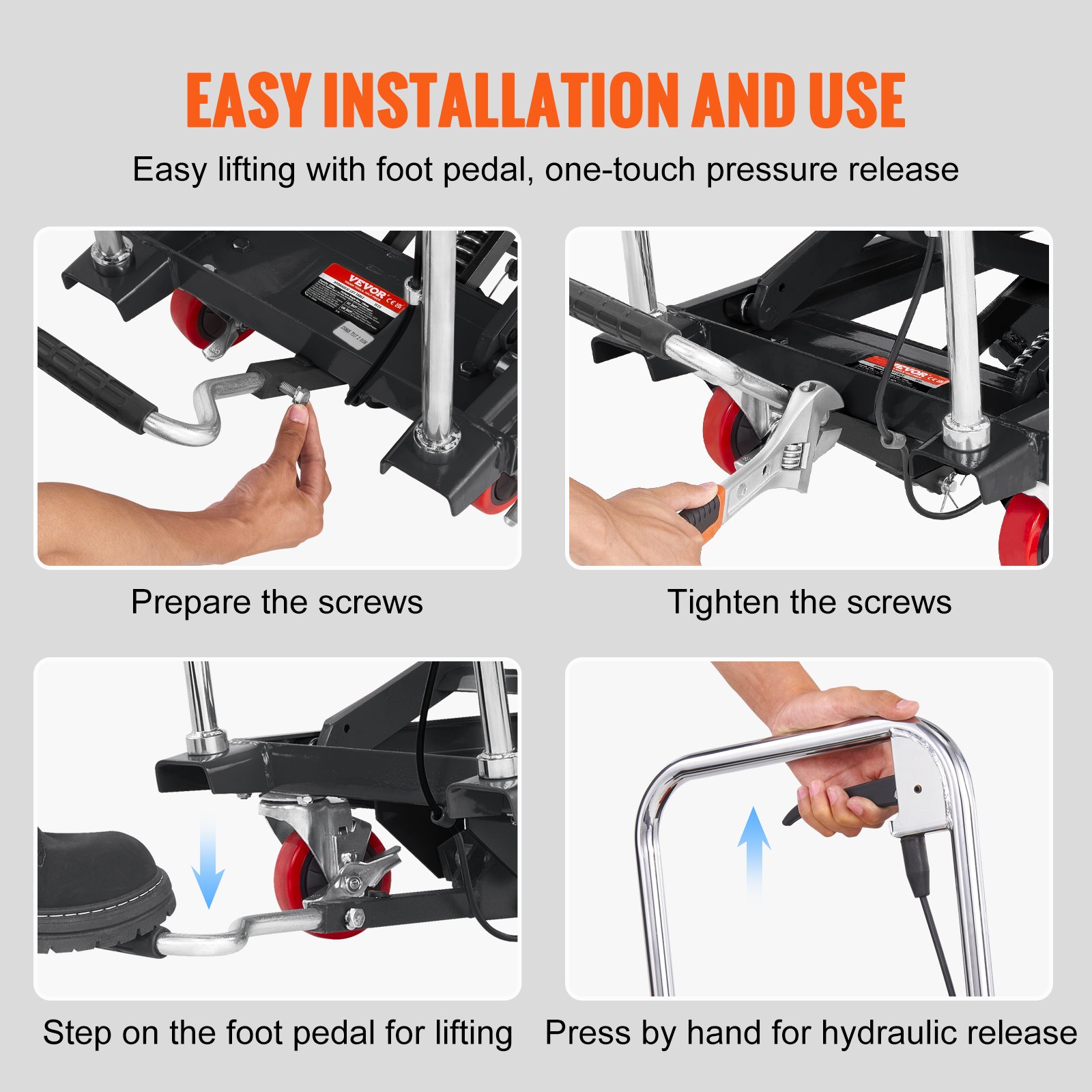 Raspon podizanja: 220-720 mm, glavni materijal: Hladno valjani čelik Q235 s premazom, stil: jednostruke škare, pumpa: hidraulična pumpa, veličina platforme: 28 x 18 in / 700 x 450 mm, neto težina: 99,2 lbs / 45 kg, nosivost: 500 lbs / 230 kg, broj modela artikla: TF23