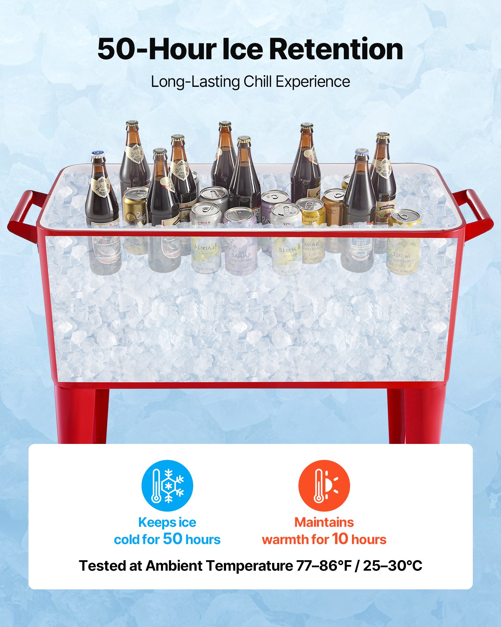 VEVOR Hladnjača za pića 75,71 L, do 50 boca/110 limenki, Prikolica za terase s 4 okretna kotačića (2 s kočnicama) i kutijom za skupljanje čepova i otvarača za boce, hladnjak za pića