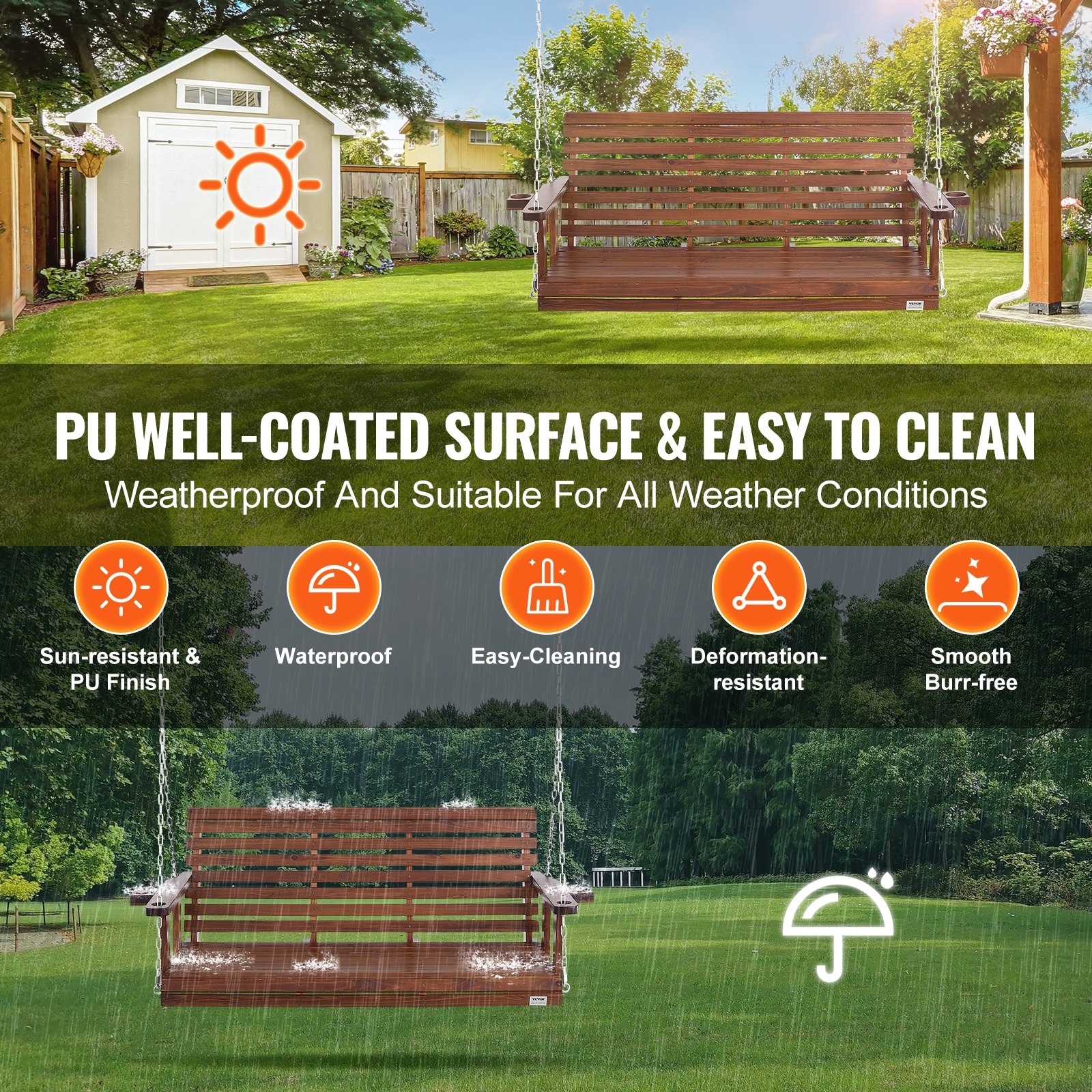 VEVOR Hollywoodska ljuljačka od cedrovine, 1702x710x600mm, Vrtna ljuljačka za dvorište i vrt, Poboljšana nosivost od cca. 400 kg, Čvrsta klupa za ljuljanje s lancima za ovjes za vanjsku upotrebu, Smeđa