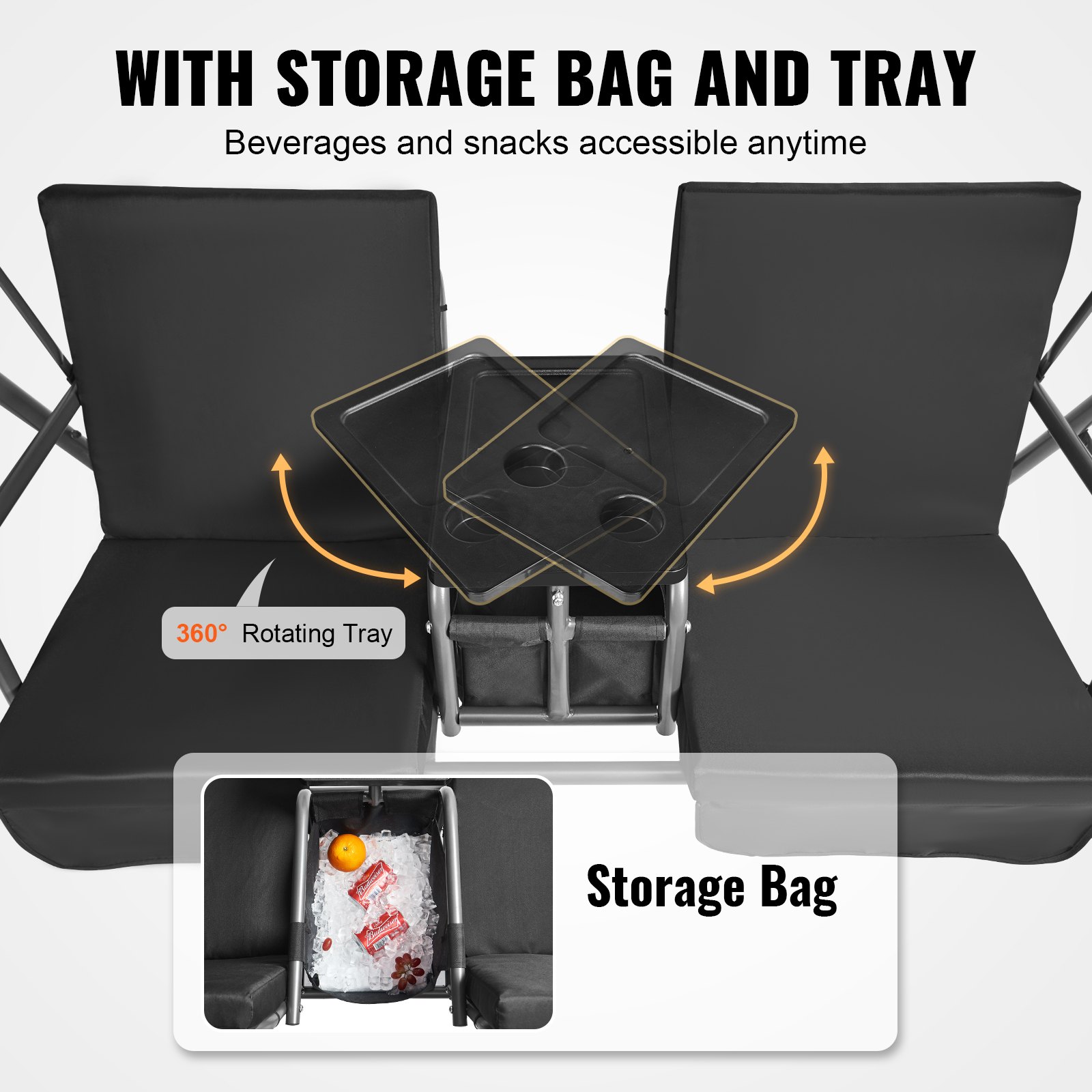 VEVOR Vrtna ljuljačka Hollywood Swing za 2 osobe s podesivim krovom, torbom za pohranu i rotirajućim pladnjem, Oxford tkanina i okvir od legiranog čelika za balkon, dvorište, crna