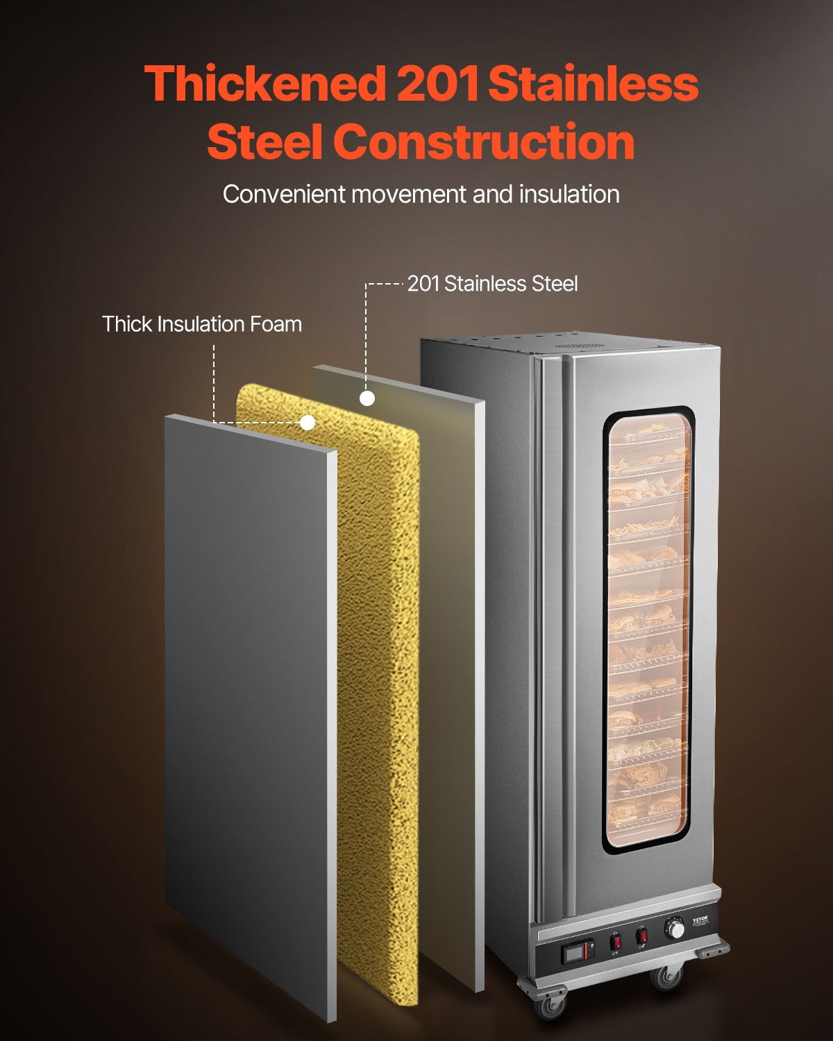 VEVOR Hot Box grijač hrane, grijač za snack bar sa 16 razina, posudom za vodu, jednostrukim staklenim vratima i podesivim policama, ormarić za zagrijavanje hrane od nehrđajućeg čelika, idealan za pohranu pizze i piletine