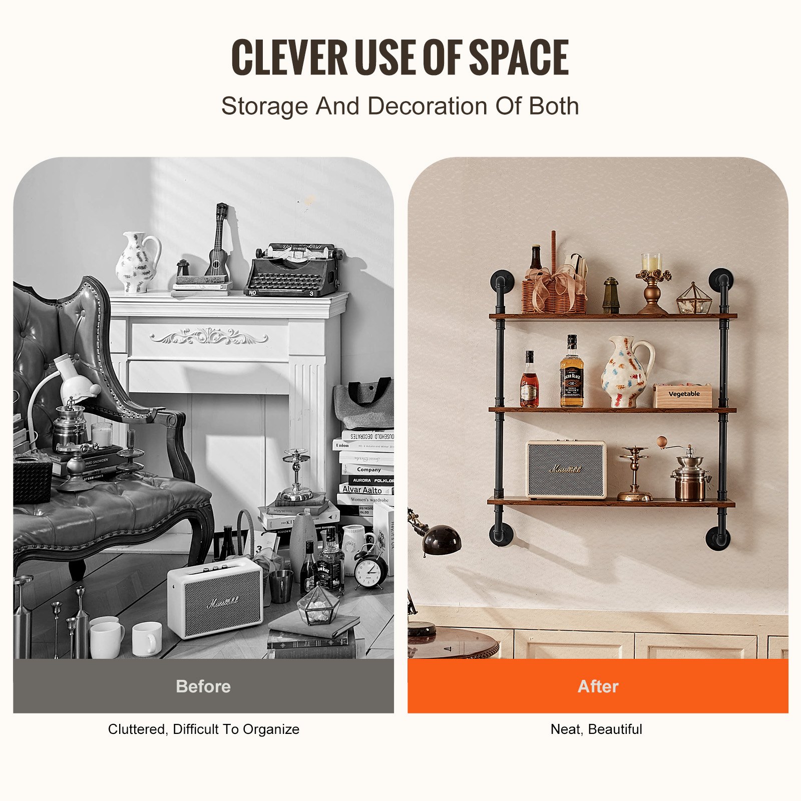 VEVOR Industrijska polica za cijevi, 3 razine, 80 x 24 cm, Zidna, Plutajuće rustikalne drvene police, Nosač, Plutajuća polica, Polica za pohranu, Držač za male dijelove za kuhinju, spavaću sobu, kupaonicu, dnevni boravak