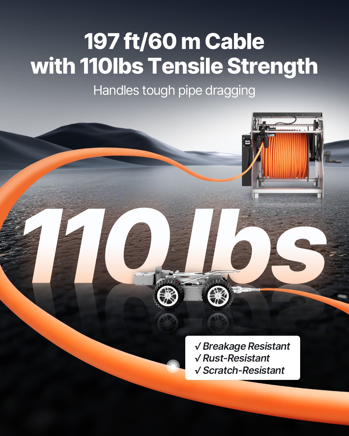 VEVOR robot za inspekciju, robot za puzanje za detekciju cijevi dug 60 m s prednjom/stražnjom kamerom od 2 MP i tabletom osjetljivim na dodir, IP68 kamera za cijevi s osvjetljenjem i brojačem udaljenosti za industrijske cijevi