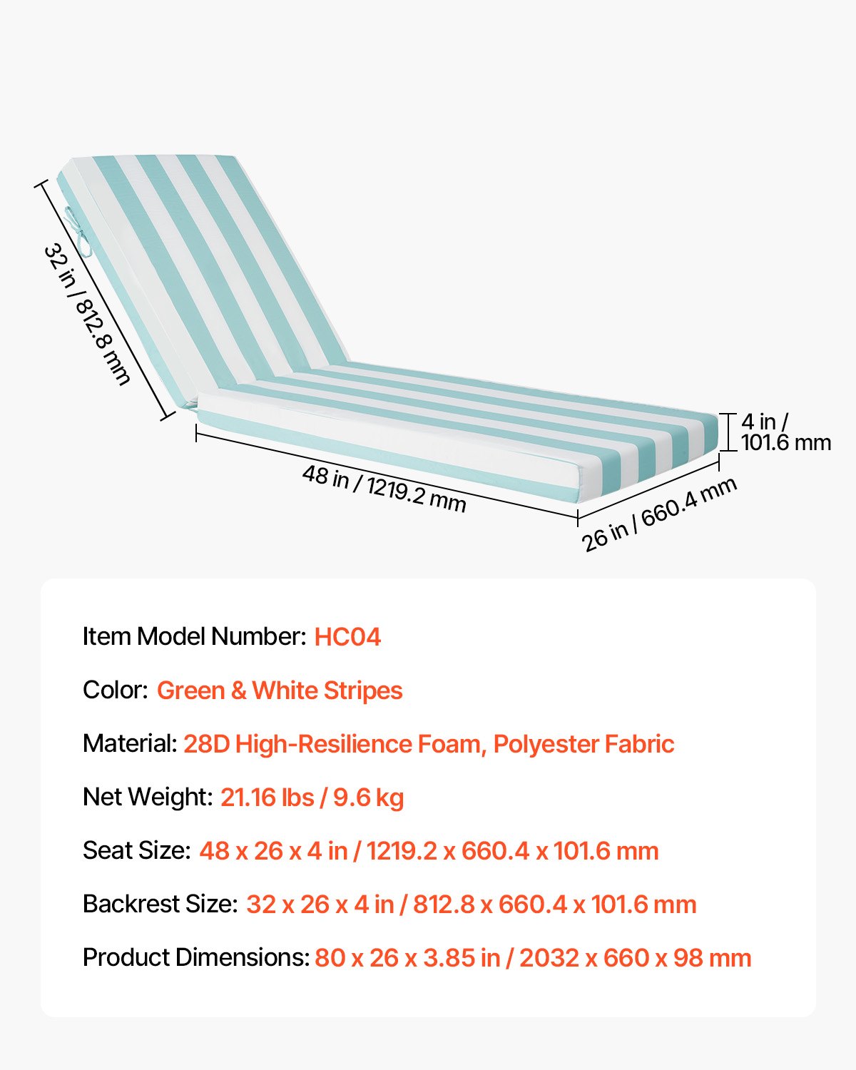 Neto težina: 9,6 kg, Boja: Zelena & Bijele pruge, Broj modela artikla: HC04, Veličina sjedala: 48 x 26 x 4 inča / 1219,2 x 660,4 x 101,6 mm, Materijal: 28D visokoelastična pjena, poliesterska tkanina, Veličina naslona: 32 x 26 x 4 inča / 812,8 x 660,4 x 101,6 mm, Dimenzije proizvoda: 80 x 26 x 3,85 inča / 2032 x 660 x 98 mm