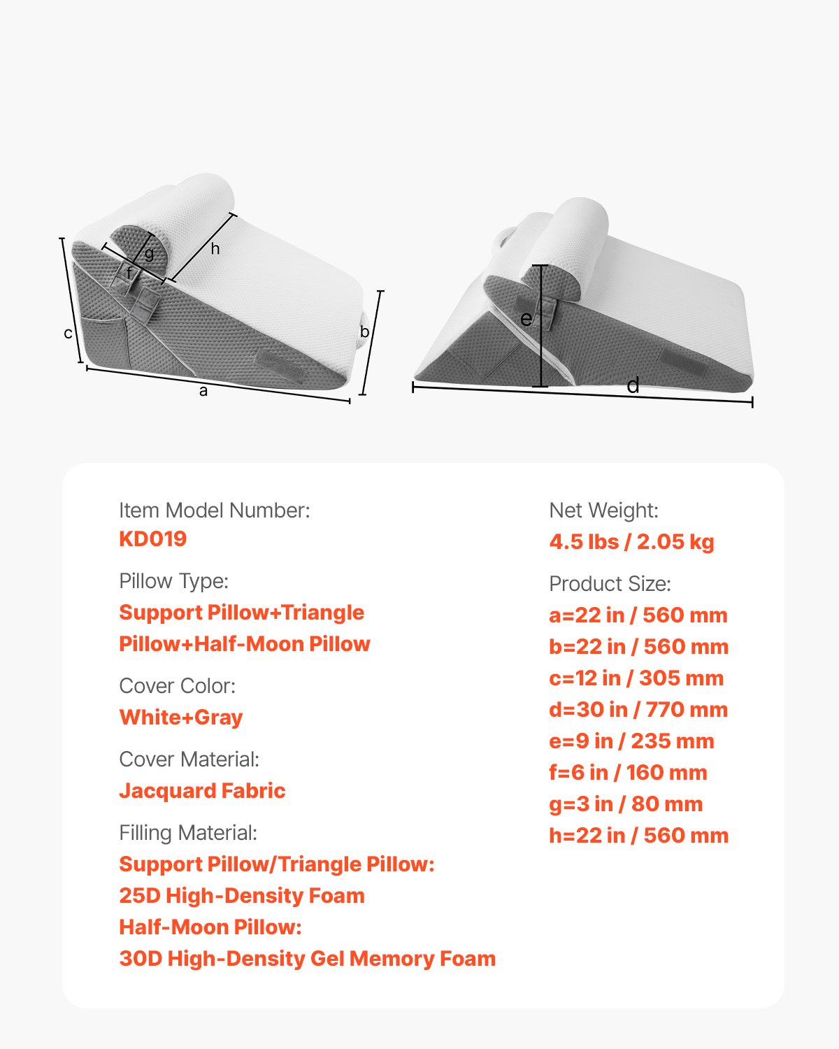 Veličina proizvoda:, b=560 mm, g=80 mm, d=770 mm, f=160 mm, Neto težina: 2,05 kg, Vrsta jastuka: Potporni jastuk + Trokutasti jastuk + Jastuk u obliku polumjeseca, Materijal navlake: Žakard tkanina, Potporni jastuk: 30D memorijska pjena visoke gustoće s gelom, e = 235 mm, Potporni jastuk/Trokutasti jastuk: 25D pjena visoke gustoće, a=560 mm, c=305 mm, v=560 mm, Navlaka Boja: Bijela + Siva, Broj modela artikla: KD019, Materijal za punjenje: