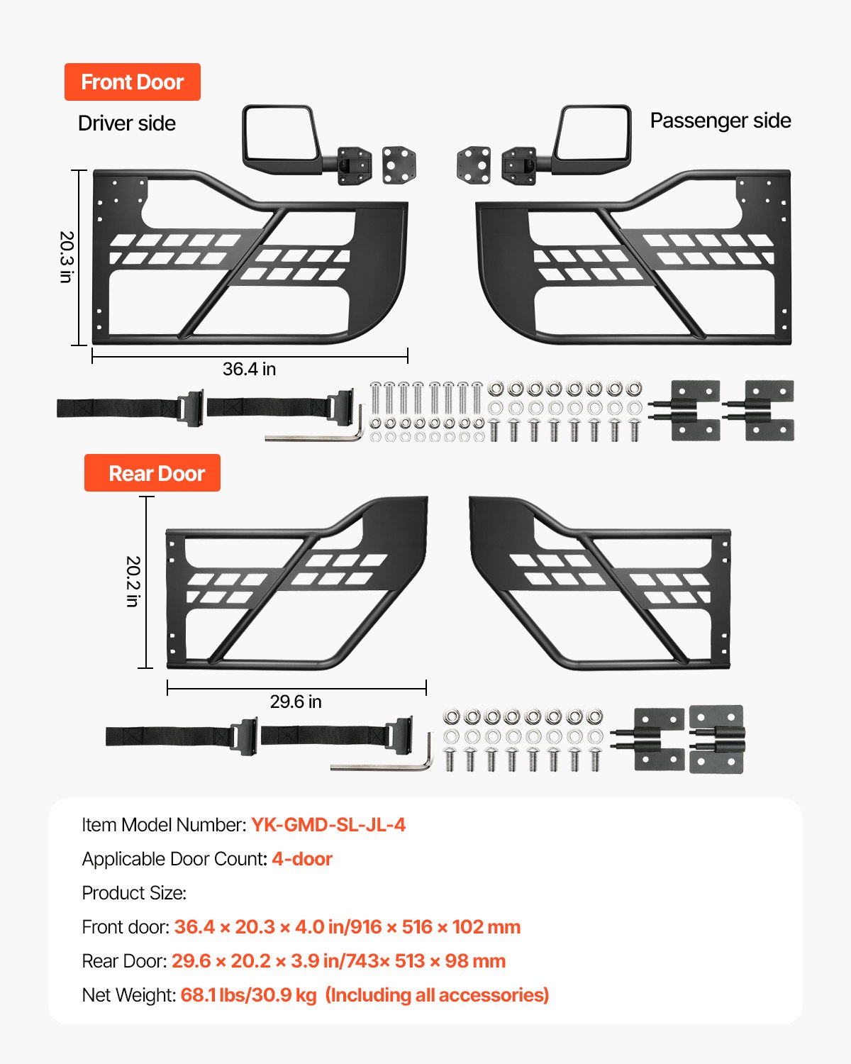 VEVOR Jeep cjevasta vrata izrađena od ojačanih čeličnih cijevi (4 vrata) u lovačkom stilu s DOT-certificiranim bočnim retrovizorima. Jeep vrata za Jeep Wrangler JL 2018.-2024. i Jeep Gladiator JT 2020.-2024.