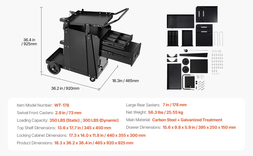 - Čvrsta konstrukcija: Ova teška kolica za zavarivanje s kotačićima izrađena su od čelične ploče debljine 1,0 mm, što pruža iznimnu čvrstoću i izdržljivost, kao i otpornost na oksidaciju i deformacije. Veličina gornjeg odjeljka: 13,6 x 17,7 inča / 345 x 450 mm, veličina ladice: 15,6 x 9,8 x 5,9 inča / 395 x 250 x 150 mm, veličina ormarića koji se može zaključati: 17,3 x 14,0 x 11,8 inča / 440 x 355 x 300 mm, a veličina cijelih kolica: 18,3 x 36,2 x 36,4 inča / 465 x 920 x 925 mm.