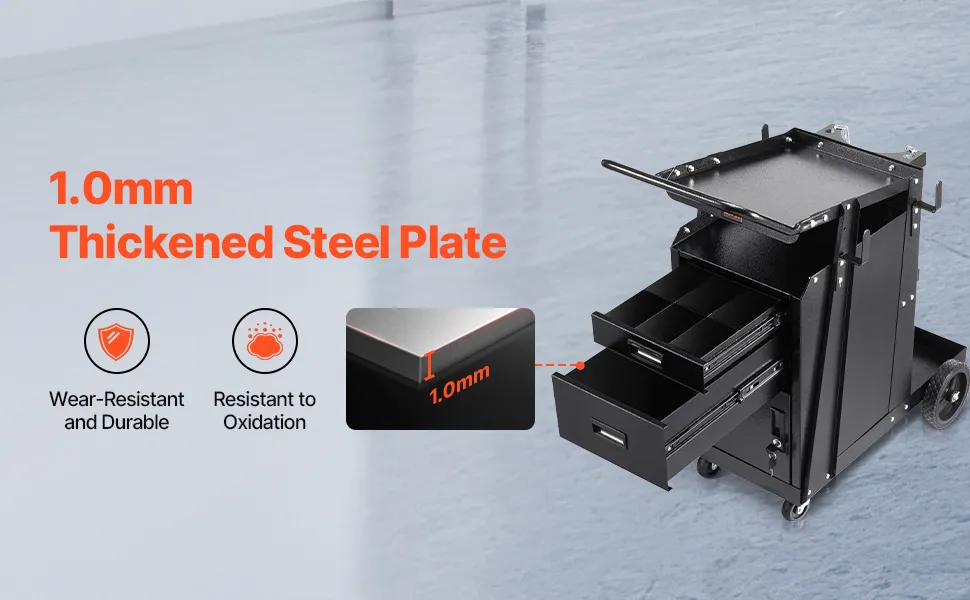 Ova teška kolica za zavarivanje izrađena su od čeličnog lima debljine 1,0 mm, što nudi izvrsnu otpornost na habanje i zaštitu od oksidacije. Dizajnirana za teške primjene zavarivanja, osiguravaju dugotrajnu izdržljivost i stabilnost tijekom vremena.