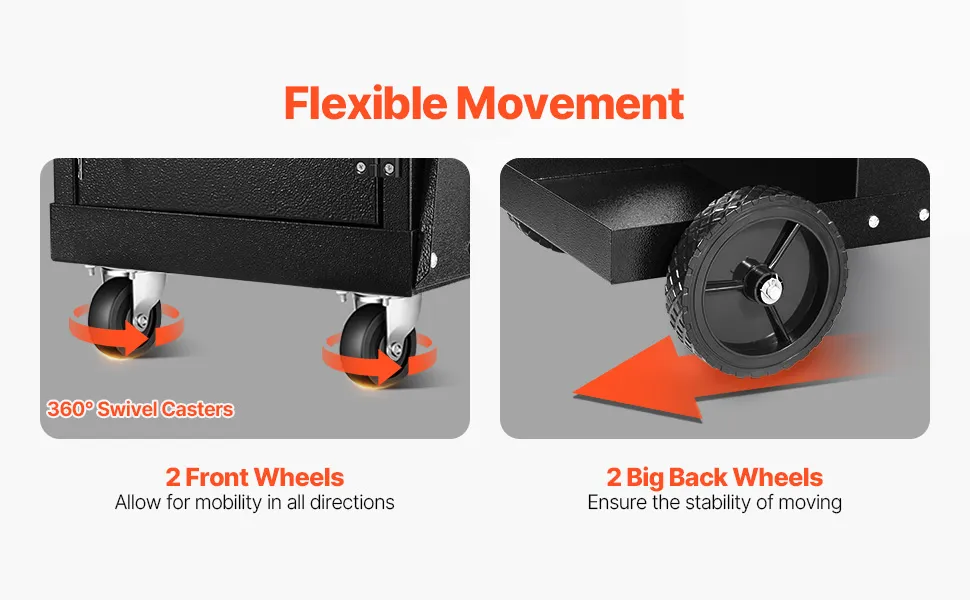 - Jednostavno premještanje: Dva prednja okretna kotačića od 2,9 inča/73 mm omogućuju fleksibilno okretanje od 360 stupnjeva, a dva stražnja kotačića od 7 inča/178 mm osiguravaju stabilnost tijekom transporta, posebno s teškim teretima. Visokokvalitetni PVC kotači apsorbiraju udarce i osiguravaju tihi rad bez grebanja poda. Neklizajuća ručka štedi guranje i povlačenje.